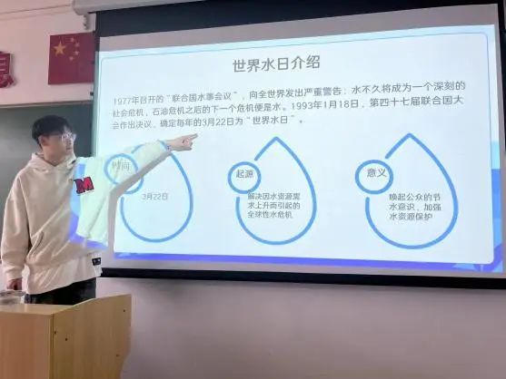 活动伊始,预备党员房怡宁同志带我们深入学习了“世界水日”的设立背景、目的以及相关意义。活动采取图文展示、视频播放、知识竞赛拍摄宣传视频等方式生动形象地向同学们普及水文科学知识,帮助同学们进一步了解节水、护水的重要性和必要性,让同学们在潜移默化中开拓视野,增长见识,将节约用水的种子深植在每个学生的内心。