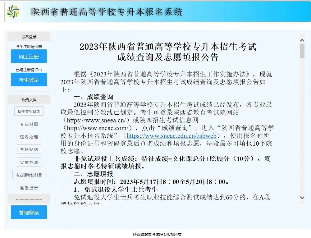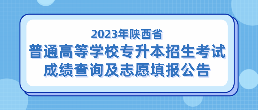 根据《2023年陕西省普通高等学校专升本招生工作实施办法》,现就2023年陕西省普通高等学校专升本招生考试成绩查询及志愿填报公告如下: