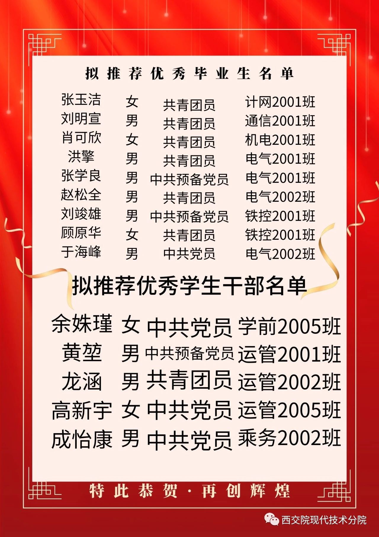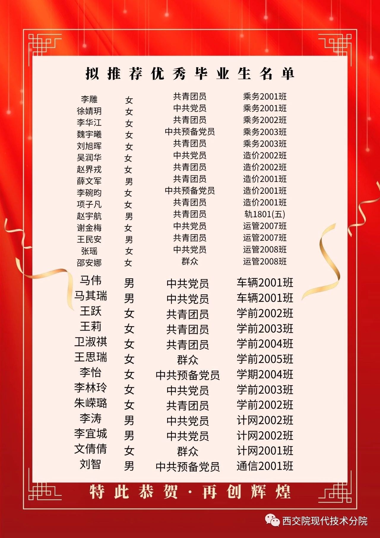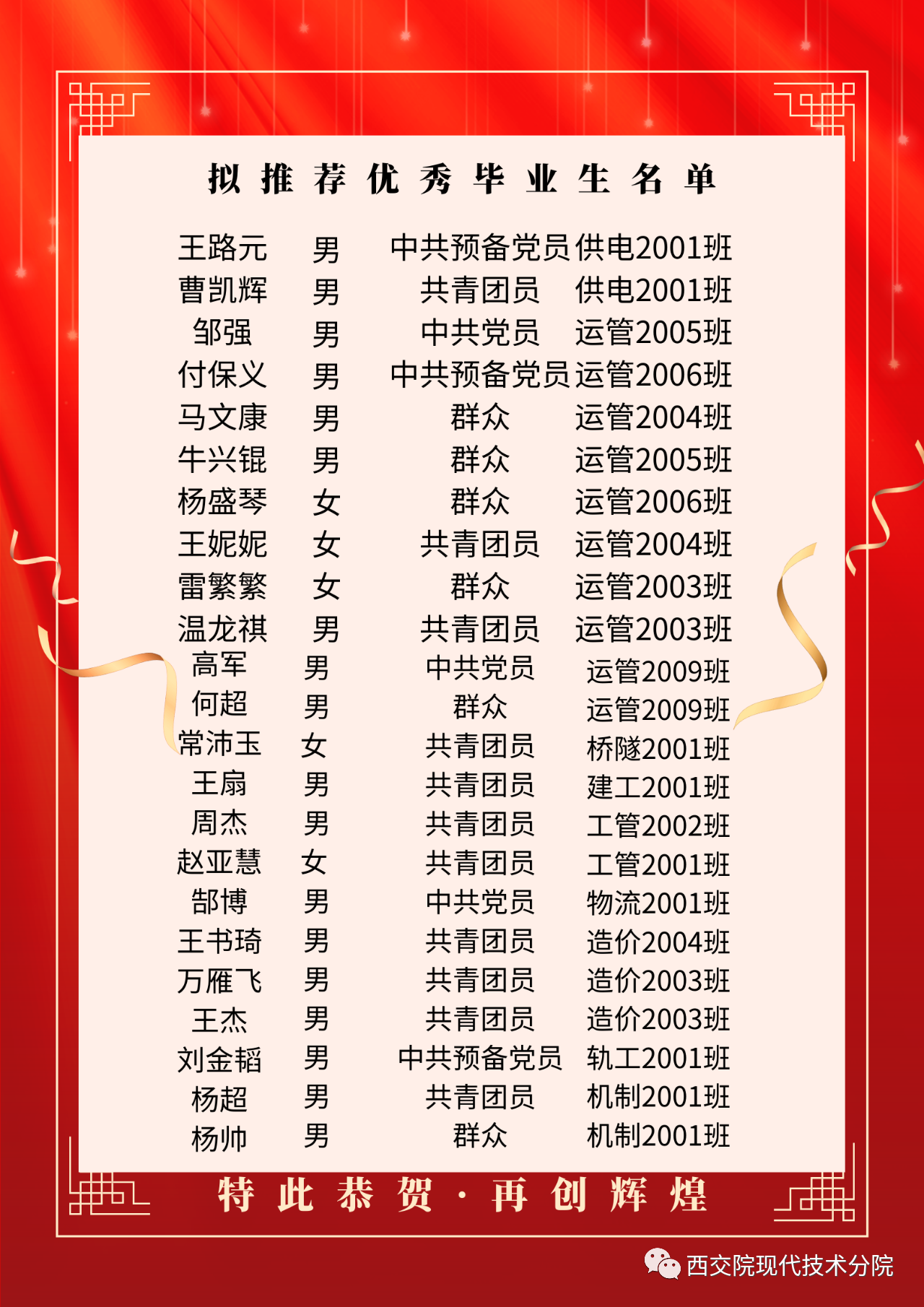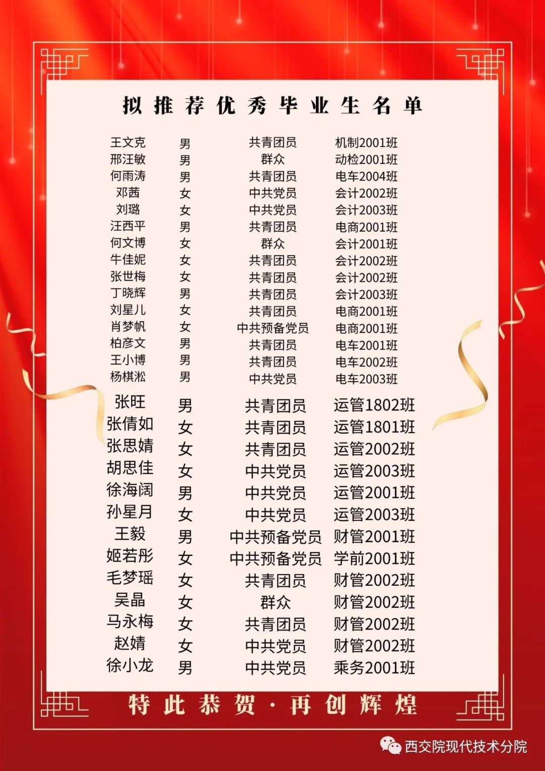 为深入贯彻党的二十大精神,落实党的教育方针和新时代教育评价改革要求,落实立德树人根本任务,认真抓好大学生先进典型的选树和培育工作,加大宣传表彰力度,形成创优争先的良好风气,充分发挥优秀毕业生的示范激励引领作用,促进毕业生更高质量更充分就业。根据《陕西省教育厅办公室关于评选2023届普通高等学校优秀毕业生和优秀学生干部的通知》、学校《关于做好2023届优秀毕业生优秀学生干部评选工作的通知》的要求和学院情况,我院在2023届毕业生中开展了评选优秀毕业生活动。经班级推荐和学院评审,共评选出优秀毕业生88人,优秀学生干部5人,现将我院2023届优秀毕业生名单向全院公示如下: