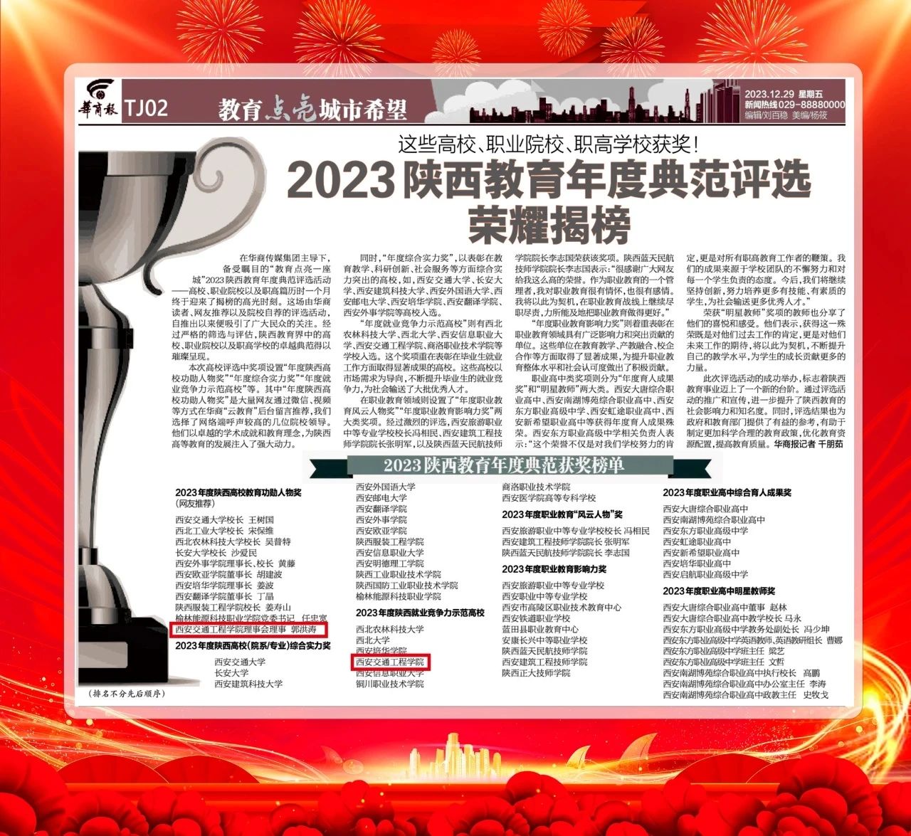 12月29日,备受瞩目的2023“陕西教育年度典范评选”荣耀揭榜,伟德国际victor1946荣获“2023年度陕西就业竞争力示范高校”奖,伟德国际victor1946理事会理事郭洪涛荣获“2023年度陕西高校教育功勋人物”奖。