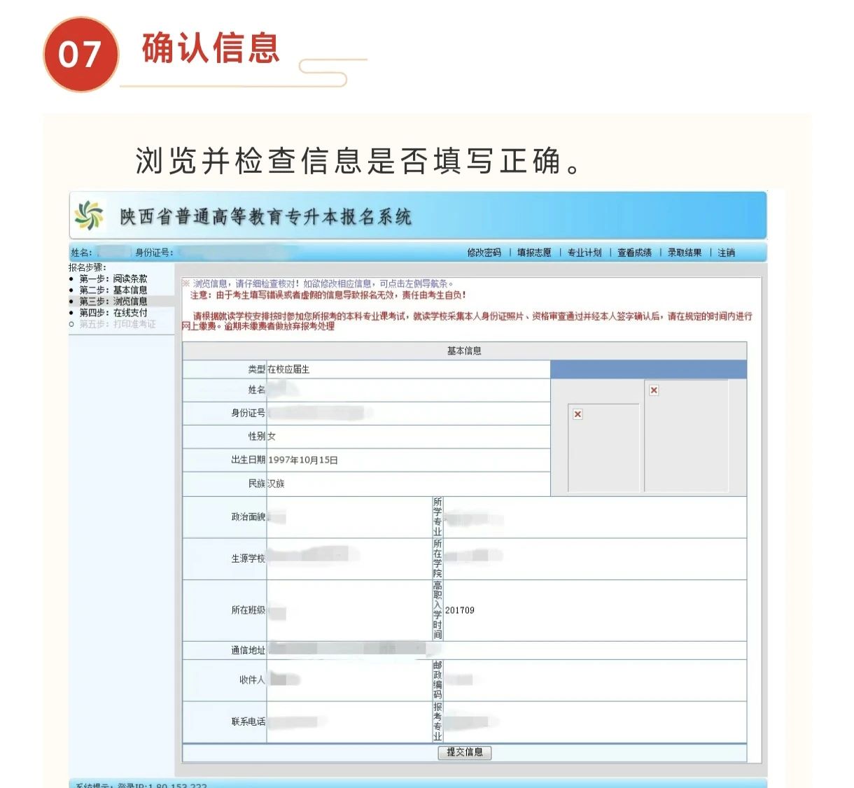 普通考生填写考生基本信息:姓名、身份证、性别、出生日期、 民族、电话、是否建档立卡贫困家庭、是否免试生、所学专业、 生源学校、所在院系、所在班级、政治面貌、地址等并确认。
