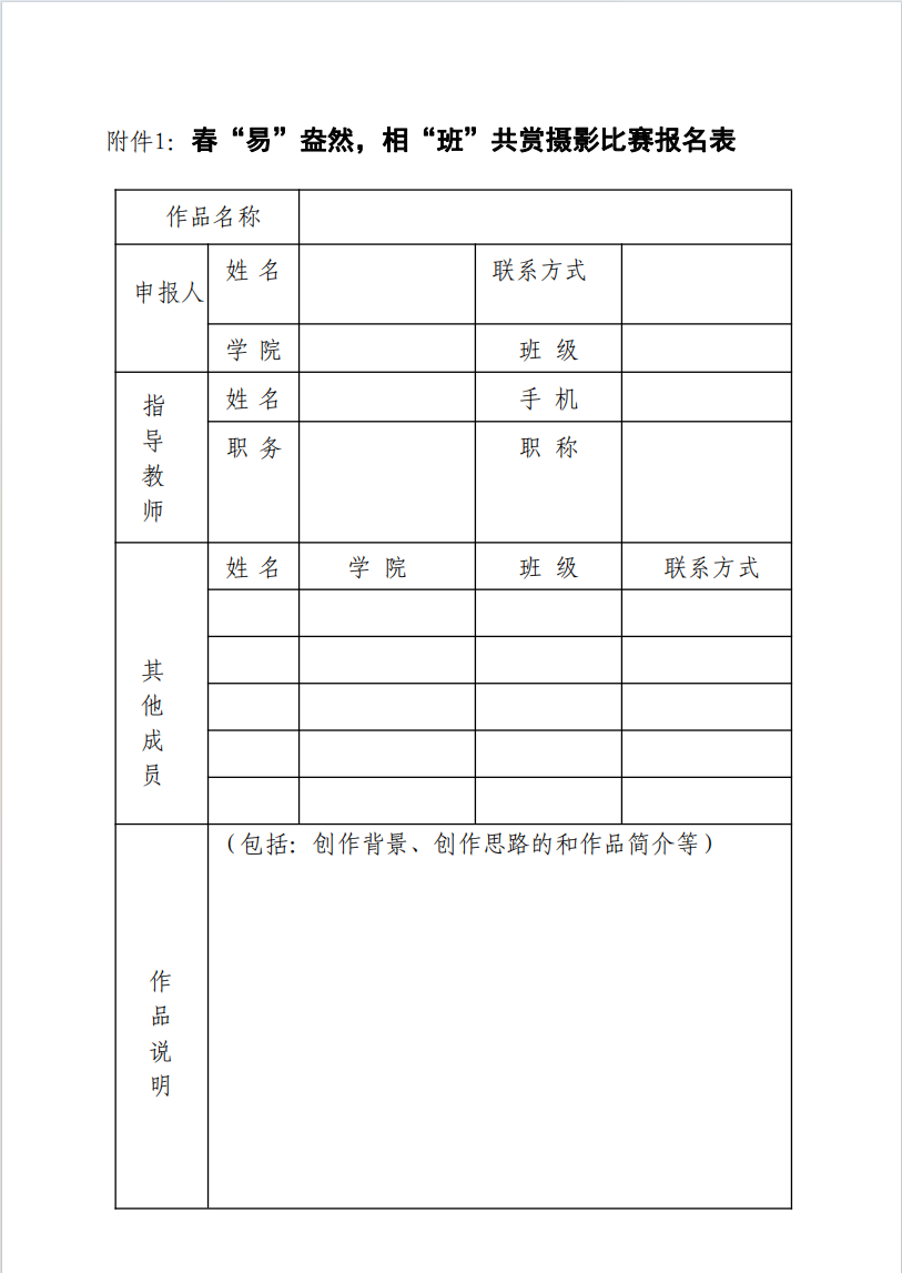 附件1:春“易”盎然,相“班”共赏摄影比赛报名表