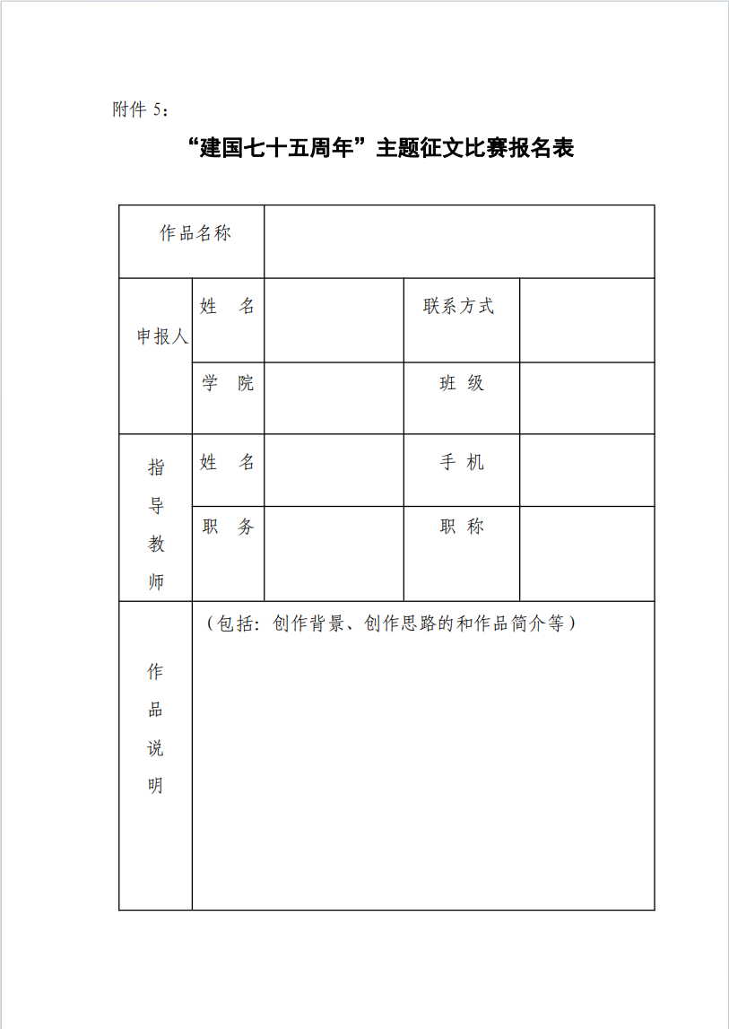附件5:“建国七十五周年”主题征文比赛报名表