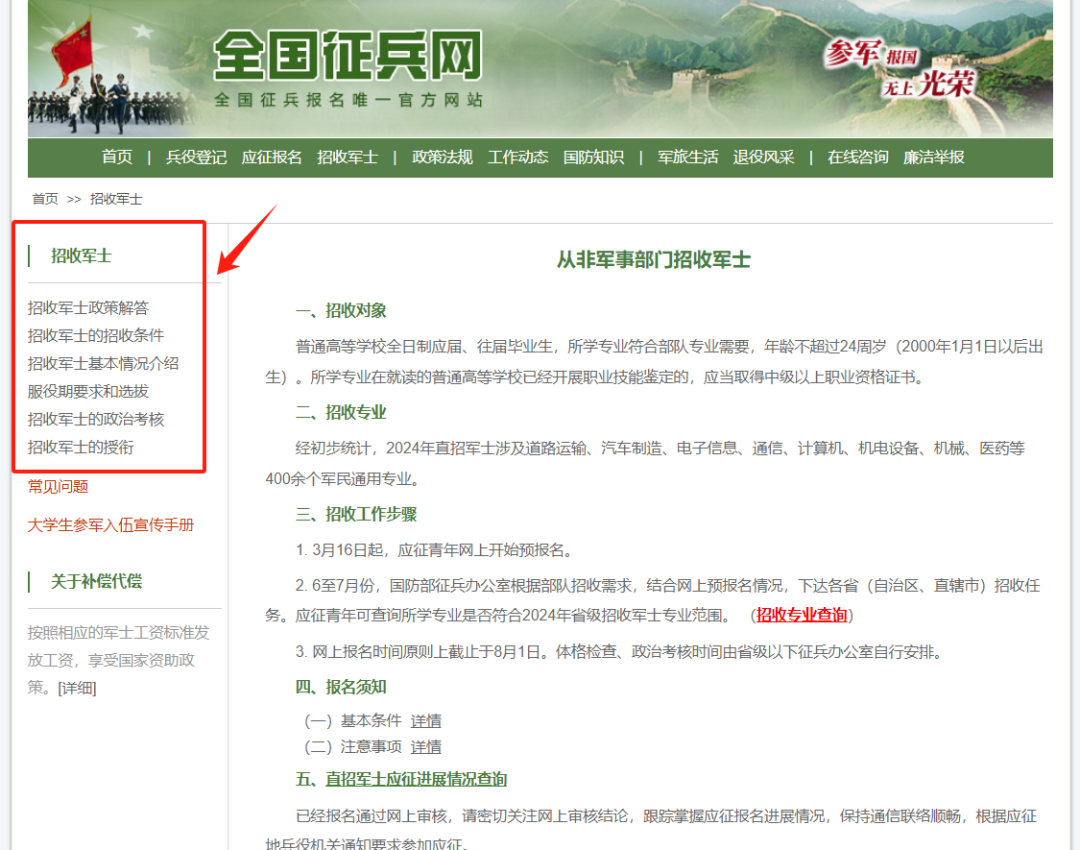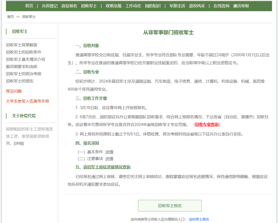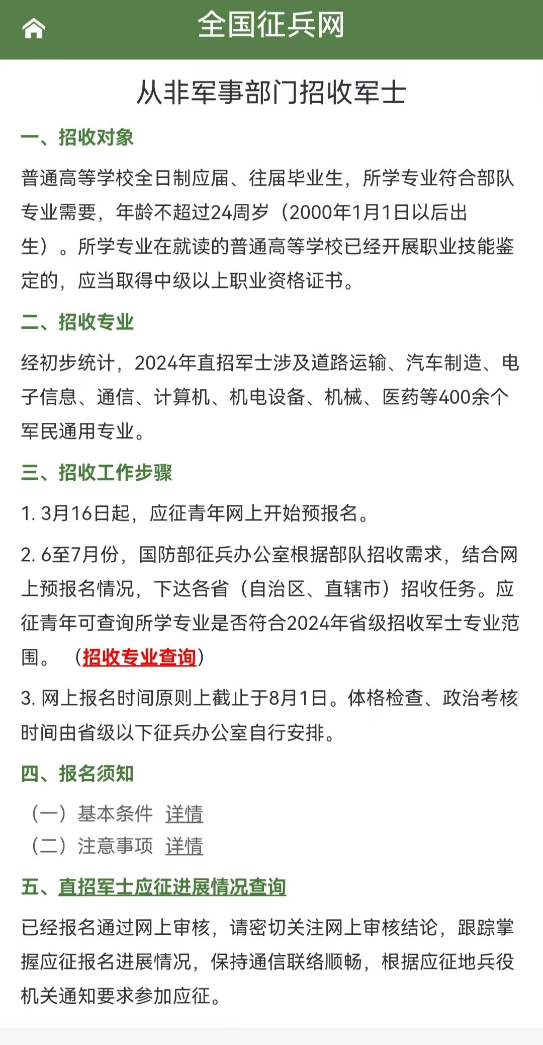 2. 6至7月份,国防部征兵办公室根据部队招收需求,结合网上预报名情况,下达各省(自治区、直辖市)招收任务。期间,应征青年可查询所学专业是否符合2024年省级招收军士专业范围。