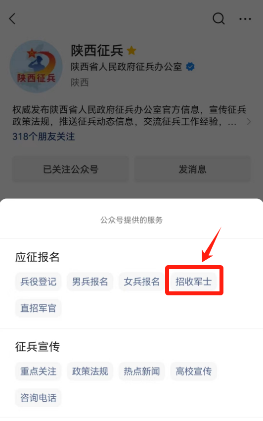 也可以关注“陕西征兵”,点击子菜单“应征报名”→“招收军士”进行网上报名。
