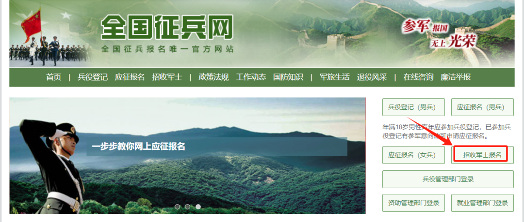 采取网上报名的方式,应征青年登录“全国征兵网”,点击“招收军士报名”查询招收专业并进行报名。