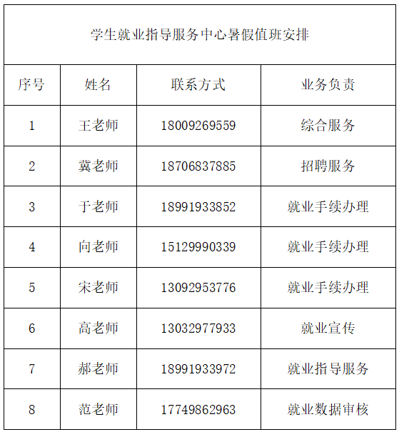 学生就业指导服务中心暑假期间正常值班(值班时间:上午9:00-11:00、下午3:00-5:00),提供业务办理服务,具体安排及联系方式如下: