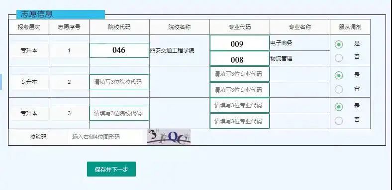 (2)报考专升本、高起专的考生可填报三个院校志愿。志愿表中设有“愿服从相同科类专业调剂”栏,愿服从者填“是”,不愿服从者填“否”。