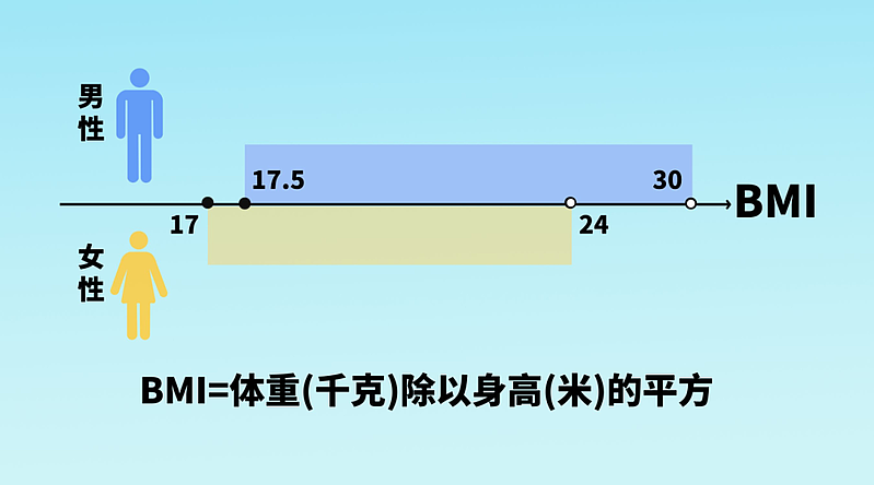 2)男性:17.5≤BMI<30,其中:17.5≤男性身体条件兵BMI<27;