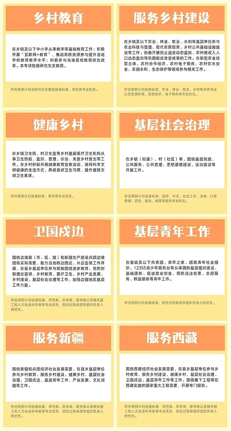 2026年西部计划项目将深入贯彻落实习近平总书记重要回信精神,引导广大高校毕业生积极参加乡村教育、服务乡村建设、健康乡村、基层社会治理、卫国戍边、基层青年工作、服务新疆、服务西藏等8个专项,以青春力量服务国家战略、服务百姓民生、服务社会治理。今年全国预计新招募约6万人,赴新疆、西藏等27个省(自治区、直辖市)和新疆生产建设兵团的基层一线开展志愿服务,90%以上的服务岗位在乡镇及以下。西部计划志愿者服务期为1至3年,服务协议一年一签。为激励志愿者服务期满继续扎根西部、扎根基层,国家在升学、就业、培养等多个方面给予政策支持。