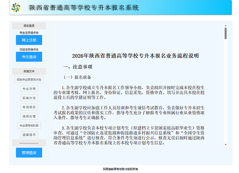 2026年陕西省普通高等学校专升本招生考试网上报名工作已全面启动。为确保广大考生顺利完成报名,省教育考试院特此提醒以下重要事项,请仔细阅读并严格遵守。
