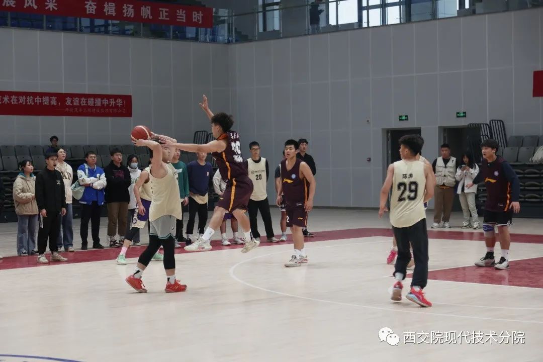 晚6时,双方队员入场,观众区座无虚席。面对机械与电气工程学院篮球代表队富有深度的阵容,我院篮球代表队主力队员姜帝丞、姬翔、程得品、吴霖浩、刘阳等迎难而上,抱着非凡决心开启赛事的最后一程。伴随哨声惊鸣双方选手跳球,总决赛正式拉开帷幕,观众呐喊声不绝于耳。决赛在双方队员激烈的对抗中进行。身着白色的机械与电气工程学院队在第一节利用外线射手的优势,借助队友的掩护制造出手空间,命中数颗三分球,一度领先二十余分,无疑将我院推到悬崖边,下半场身着红色闪电队服的现代学院队顶住巨大的压力,改变战术打法配合,换防限制对手外线投篮空间,又通过一次次突入内线造成杀伤,逐渐抹平比分。在接下来的下半场中,我院球员利用包夹的方式造成了对方球队连连失误,并延续了上半场的火热手感,在排山倒海的造势之下,末节轰出一波12比3的比分,至此比赛完全失去悬念,我院队员选择放弃最后一攻,践行友谊第一比赛第二的赛事理念。