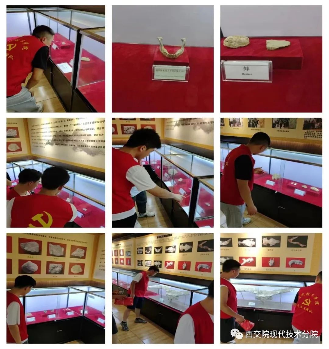 蓝田实践团的成员们进入展厅,映入眼帘的有文物百余件,其中包括蓝田猿人头盖骨化石、陈家窝人下颌骨化石、石器百余件,另有30多种动物化石。并且在讲解员的介绍下实践团成员们知道了,猿人住在洞穴中,生活环境险恶,使用的工具,是极其简陋的粗糙石器和木棒,靠个人力量无法生存,通常是几十个猿人群居生活,大家共同劳动,共同分享劳动果实。这种原始人群是以血缘关系组合起来的,称为血缘家族。实践团成员们不禁感叹猿人的动手能力和他们在野外生活的各种技巧,这是我们值得学习的精神和技巧。