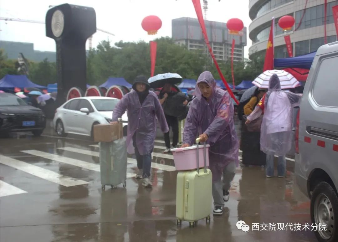 虽然天空下着大雨,但也丝毫不影响现代学子的热情。来自五湖四海的萌新们携大包小包来到了宿舍楼前,志愿者身着雨衣挥汗如雨,往返奔走于宿舍与服务点,为萌新的行李“保驾护航”,同时也热情细致的向新生们介绍着校园的基础设施。