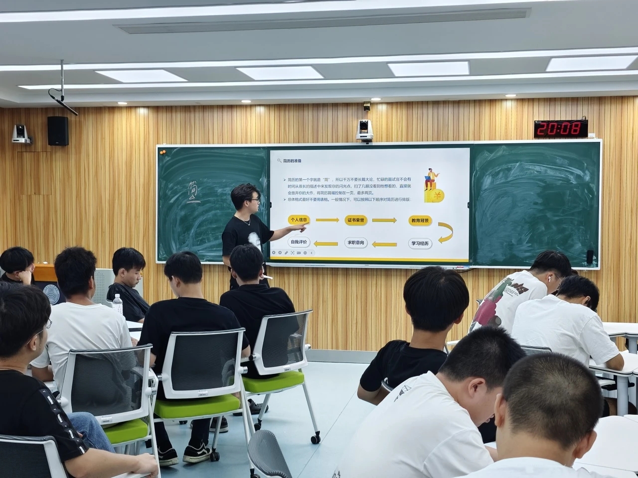 在分享会上,丁柯豪同学从简历制作、信息获取和面试谈判等方面向大家分享了自己的求职经历。他建议同学们在简历制作中要着重凸显与目标岗位相契合的能力和经历,确保简历的针对性和实效性;要积极通过参与校园招聘会、关注相关公众号等途径打破信息壁垒,及时捕捉各类招聘信息。在面试方面,他鼓励同学们勤问、勤投、勤面,在实践中不断复盘面试经验,提升随机应变的能力。最后,他建议大家,应注重提升个人素质、职业技能和实践经验,以增强个人竞争力,提升就业机会,进一步学习课堂理论知识和考取相关证书,将理论与实践相结合,以增加获得理想职位的可能性。
