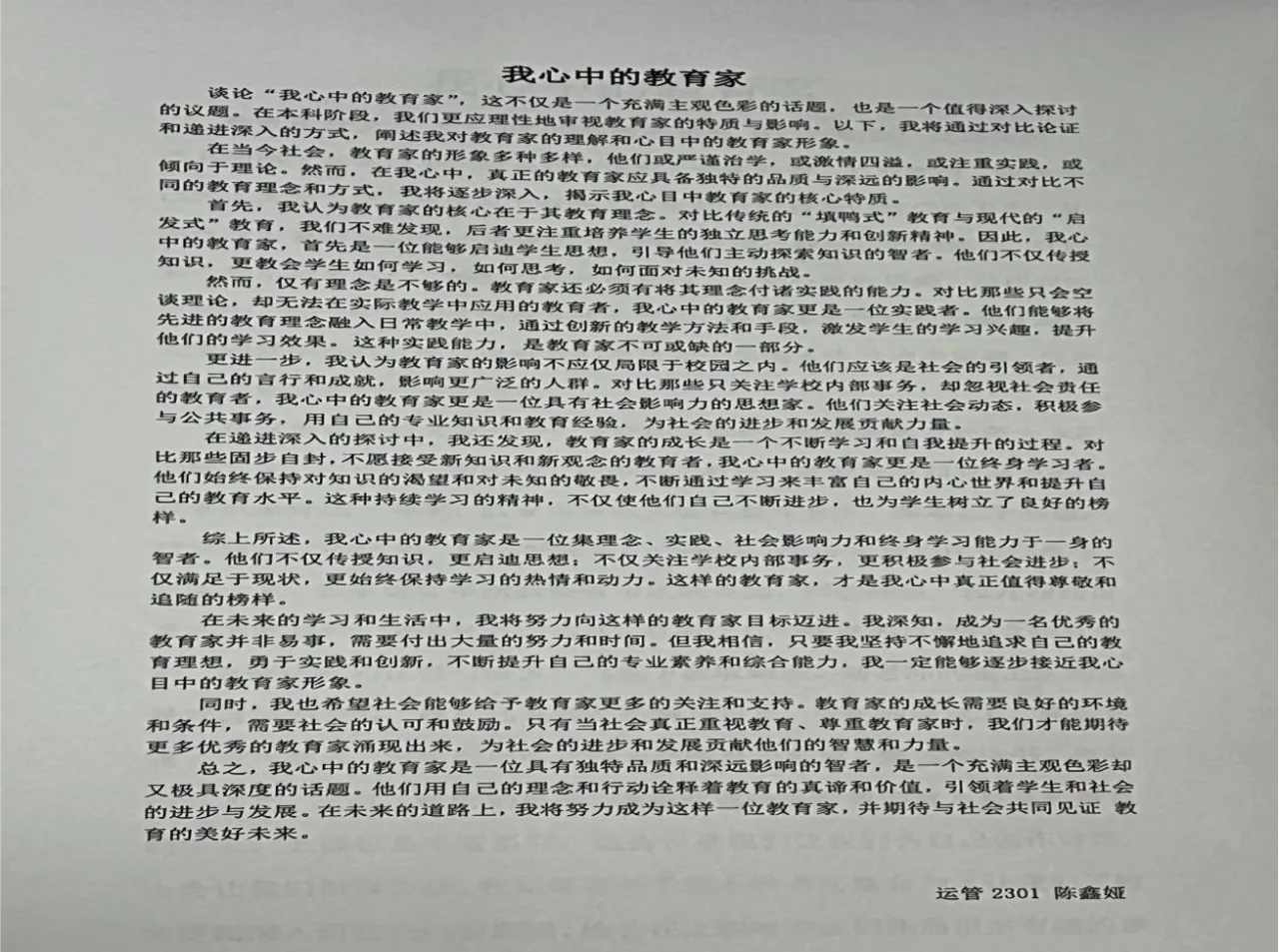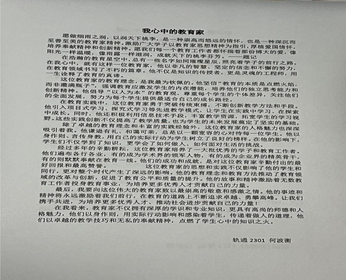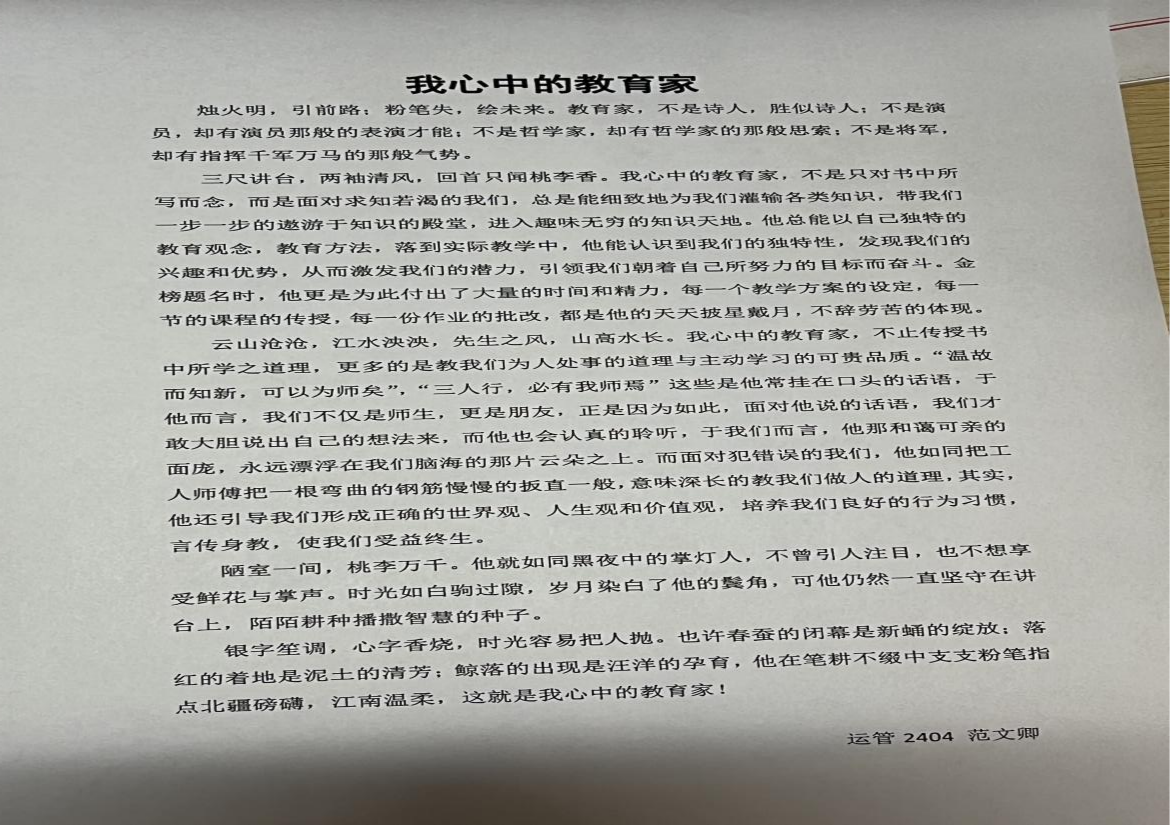 在人生的长河中,总有一些人如同璀璨星辰,以他们的智慧与爱心照亮我们前行的道路,引领我们探索未知的世界,塑造我们的灵魂与品格。为激发同学们的学习热情,鼓励学生以优秀教师为榜样,树立正确的学习观和人生观,激发学习热情和动力,我院于8月29日-9月10日举办“我心中的教育家”主题征文比赛。本次比赛,我院同学积极参与,紧扣主题,结合个人经历、感悟与想象,创作出一篇篇富有创意和感染力的文章。