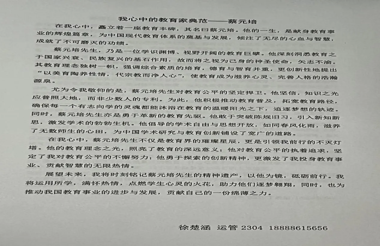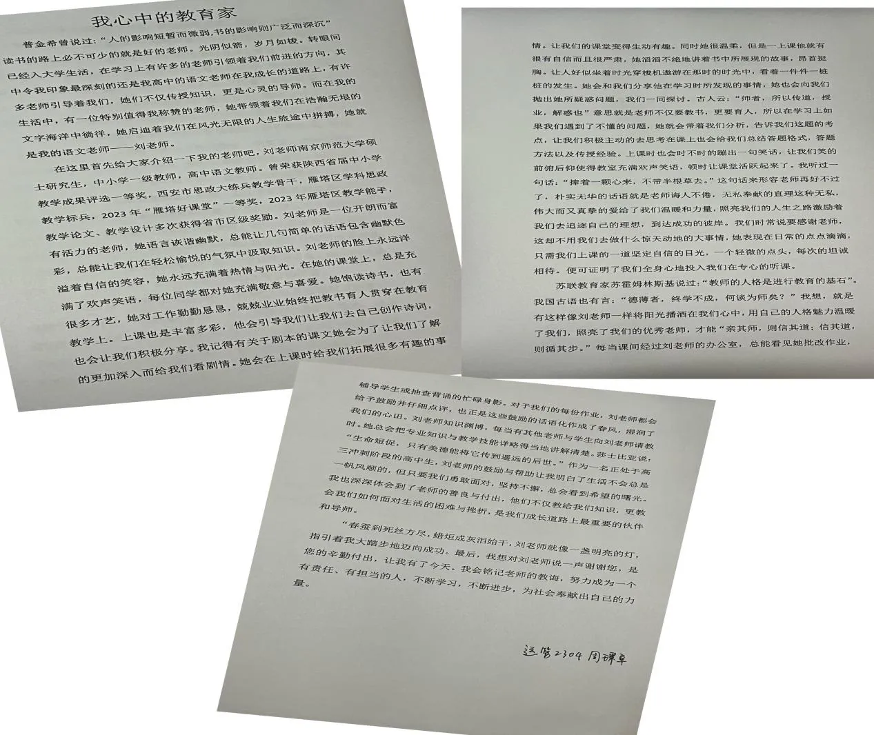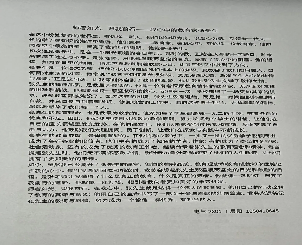 在人生的长河中,总有一些人如同璀璨星辰,以他们的智慧与爱心照亮我们前行的道路,引领我们探索未知的世界,塑造我们的灵魂与品格。为激发同学们的学习热情,鼓励学生以优秀教师为榜样,树立正确的学习观和人生观,激发学习热情和动力,我院于8月29日-9月10日举办“我心中的教育家”主题征文比赛。本次比赛,我院同学积极参与,紧扣主题,结合个人经历、感悟与想象,创作出一篇篇富有创意和感染力的文章。