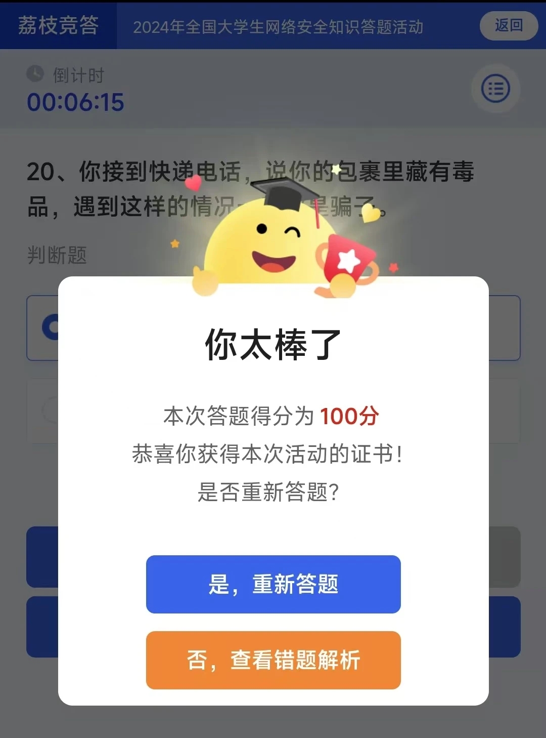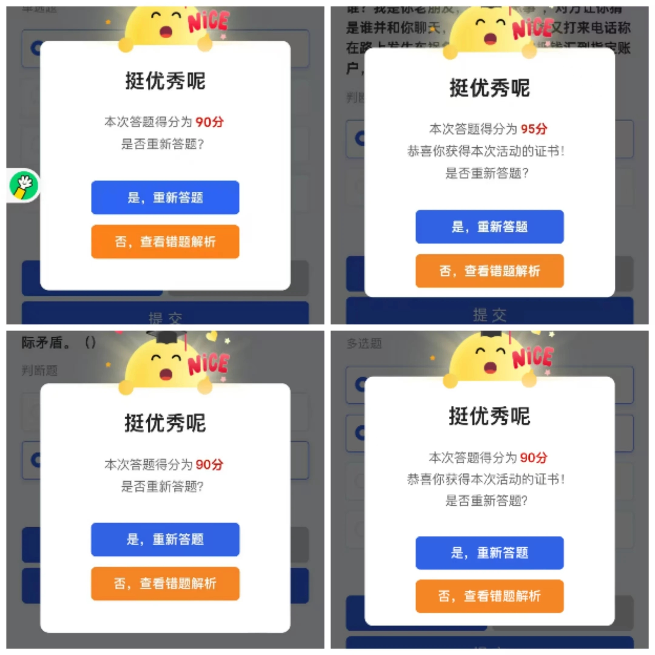 本次活动,通过在线答题的方式参与。在答题过程中,同学们认真思考,仔细答题,将自己带入到问题所设计的场景中,切身体会在“大数据”时代下网络诈骗的可怕之处,以及安全使用网络的重要性。从不同侧面,多角度地展示了同学们对于网络安全重要性的领悟和体验,学会理智的对待各种网络诱惑,明白沉迷网络的危害。活动的成功开展,使得更多的学生了解了网络诈骗的可怕之处,让同学们更加深入地认识到网络带给我们的利与弊。