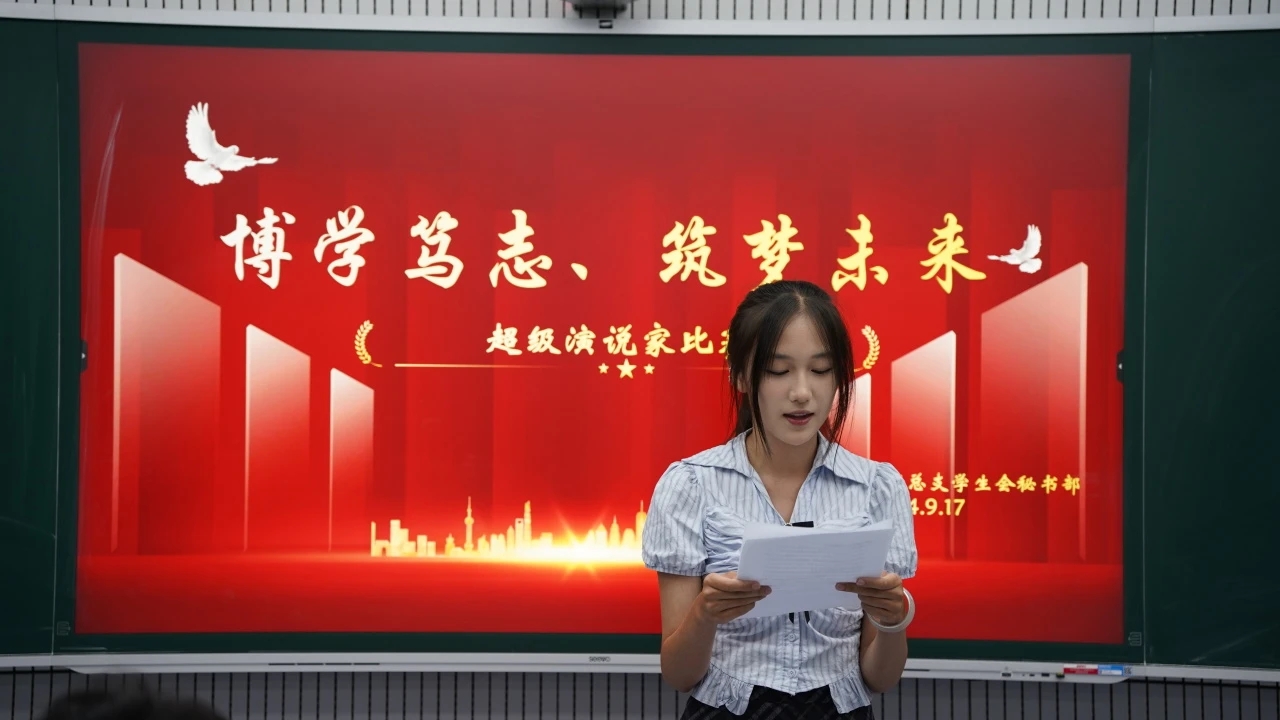 为弘扬时代主旋律,传递时代好声音,为传承弘扬西交院“自强不息 修德载物”校训精神,全面展现我校建校 30 周年以来取得的辉煌成就,落实立德树人的根本任务,共同见证、记录学校师生在党的领导下团结奋斗、艰苦建校、开拓进取、积极服务社会取得的重要成绩,弘扬“笃实惟新 负重图强 驰而不息 交通报国”的交院精神和“自身硬 扎得稳 靠得住”的道钉精神,提高全校师生的文化自信,营造知史爱校的良好风气,深刻领会代代交院人的奋斗历程,奋力谱写加快建设交通强国的交院篇章,我院团总支学生会秘书部9月17日下午于7-207举办“博学笃志、筑梦未来”超级演说家比赛。本次比赛由学生干部罗悦僮、陈佑科、张童晓、 肖楠、赵敏敏担任评委,由孙国红主持。