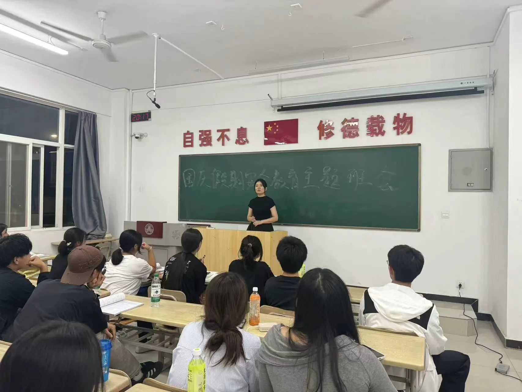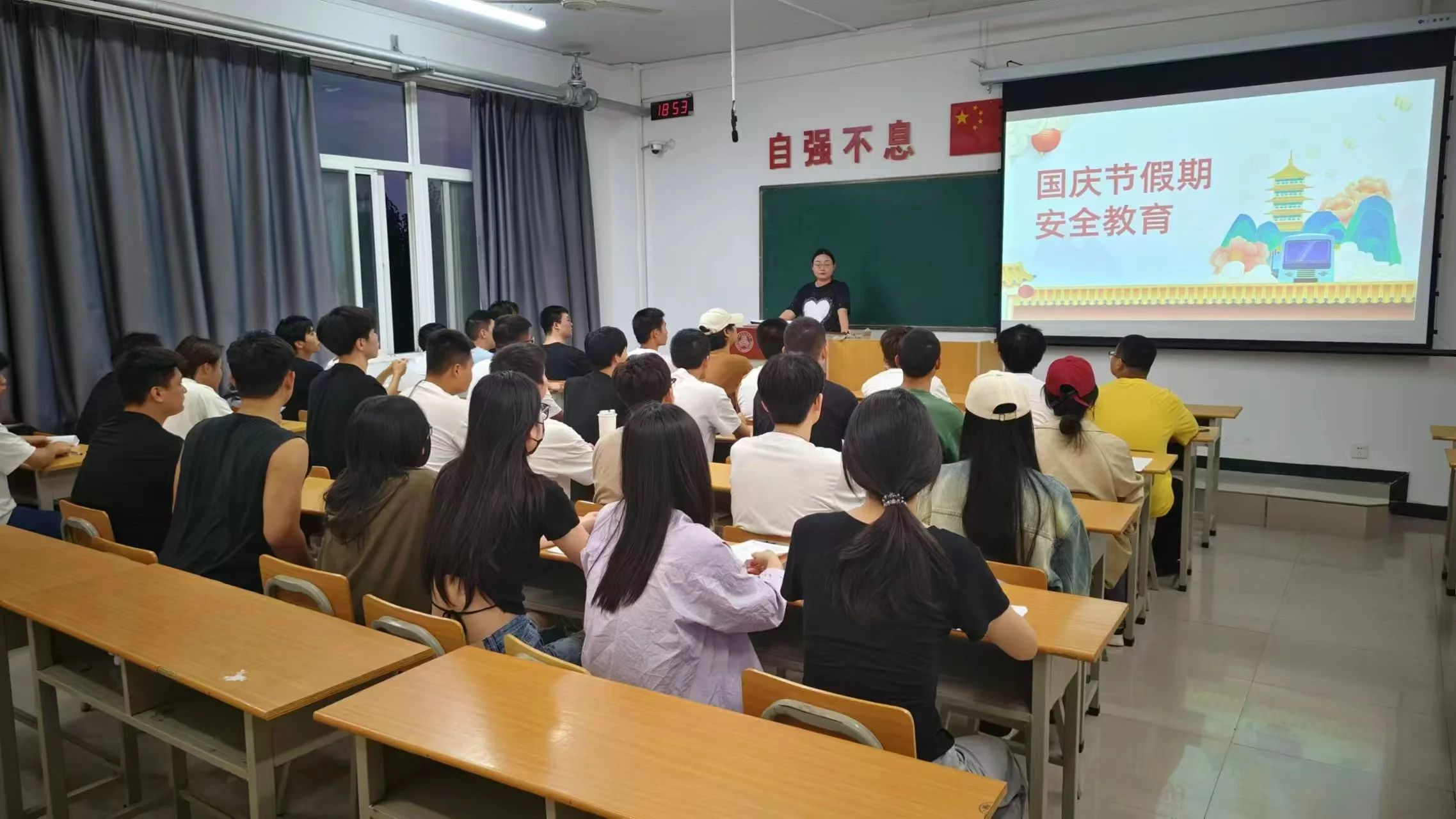 班会上,各班利用PPT、视频等多媒体手段,从不同角度和层面,对人身财产安全、交通安全、网络安全、消防安全、饮食安全、心理安全、防雷电、防溺水等重要内容进行了深入讲解和案例分析。提高学生自我保护和自救自治能力,防止事故以及打架、斗殴等治安及刑事案件发生。提醒学生注 意人身、财物安全,重点要加强对女生的安全教育。对假期在校学生要摸底登记,做出妥善、周密安排,对离校学生去向、联系方式进行严格登记。国庆节放假期间是公众活动及亲朋好友聚会的高峰期,请保持良 好的卫生习惯,少去人多拥挤的地方,避免感染传染性疾病。放假前要进行水、电、门、窗等安全检查,发现问题和隐患要逐一建立台账,及时处理,消除安全隐患,防止 发生重大安全事故,并做好节日期间防火、防盗、防事故等工作。