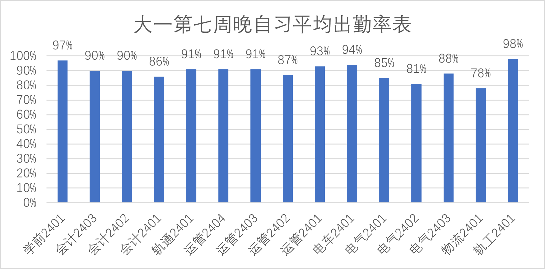 大一第七周晚自习平均出勤率表