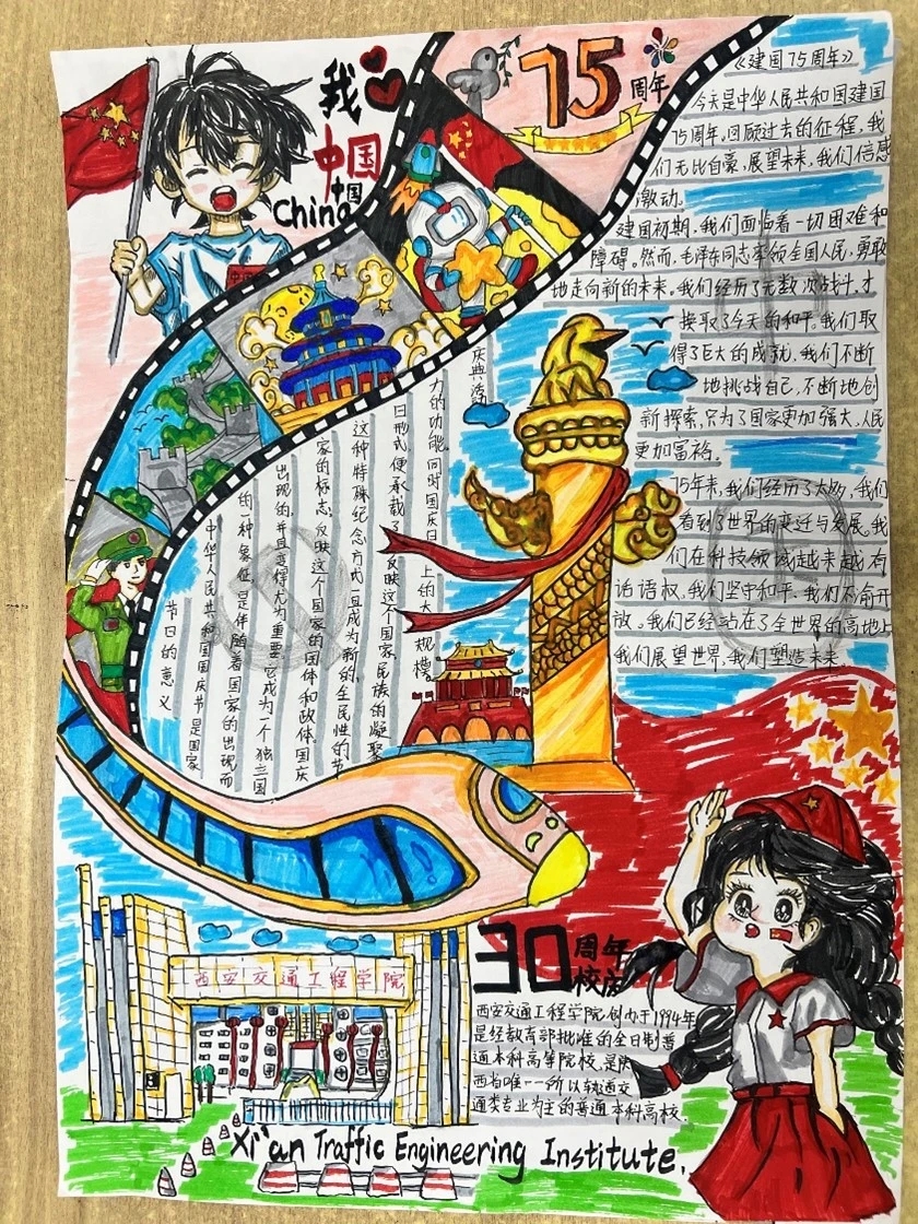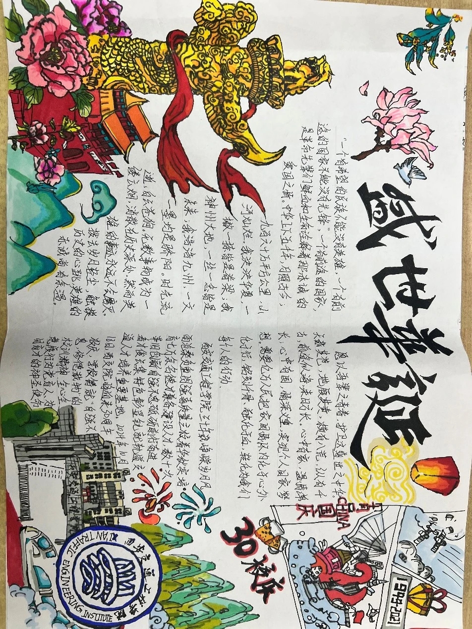活动开始以来吸引众多学生踊跃参与,他们以丰富的想象力和创造力,将学院三十年来的发展变迁、优秀教师的风采、学子们的成长故事等内容生动地呈现在在那仅仅A3大小的纸上。他们用文字和图画淋漓尽致的展现自身对祖国和校园的情感,描绘着学校的美丽风景和丰富多彩的校园生活,表达了对未来的美好憧憬和祝福,纸张虽小但韵味浓厚。
