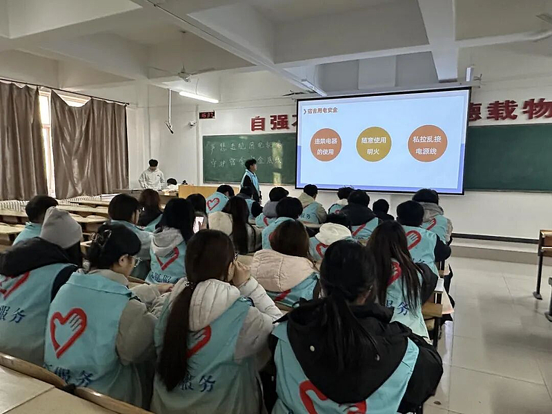 当日下午,宿舍安全主题宣讲在教学楼多功能教室顺利举行。宣讲现场,志愿者代表马继涛通过精心制作的 PPT,围绕宿舍安全核心要点展开详细讲解。PPT 中不仅呈现了高校宿舍电气火灾的真实案例视频与图片,触目惊心的场景让同学们深刻认识到违规用电的严重危害;还明确界定了违规用电的具体情形,详细列出超过 800W 的电热设备等大功率电器范围,同时细致讲解了插座规范使用、电线合理收纳等正确用电知识,以及灭火器操作方法、逃生路线规划等火灾应急处置技能,并结合学校宿舍管理条例重申了违规用电的处罚规定。宣讲过程中,工作人员与同学们积极互动,耐心解答大家提出的疑问,让安全用电知识深入人心。