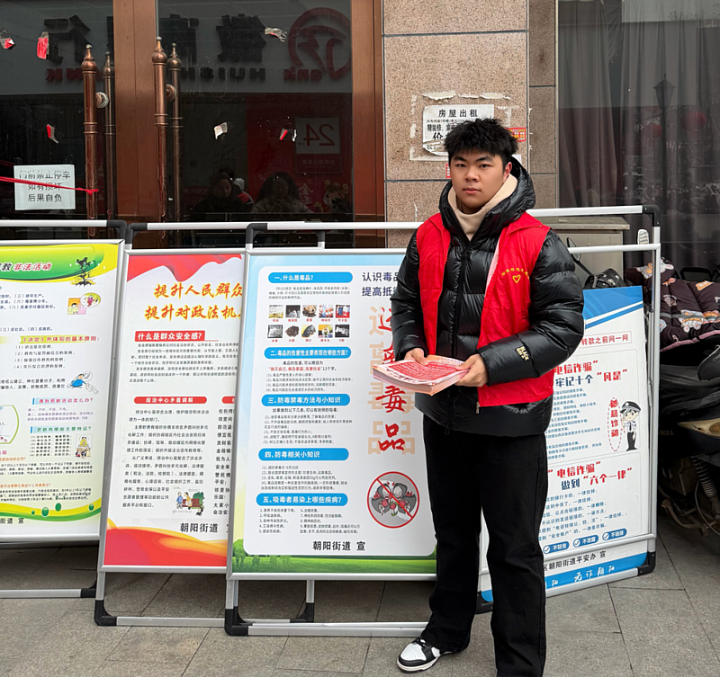 新春将至,平安为先。为营造安全祥和的节日氛围,姚舜泽主动参与社区安全宣传志愿服务,聚焦反诈、禁毒、反邪教三大主题开展公益宣讲。他深入小区街巷,通过发放宣传资料、面对面科普讲解等形式,向居民普及安全防范知识,结合节日风险特点提醒群众提高警惕、增强防护意识,以青春力量守护社区平安,用实际行动践行“奉献、友爱、互助、进步”的志愿精神,为家乡平安过节、文明过节贡献青年智慧。
