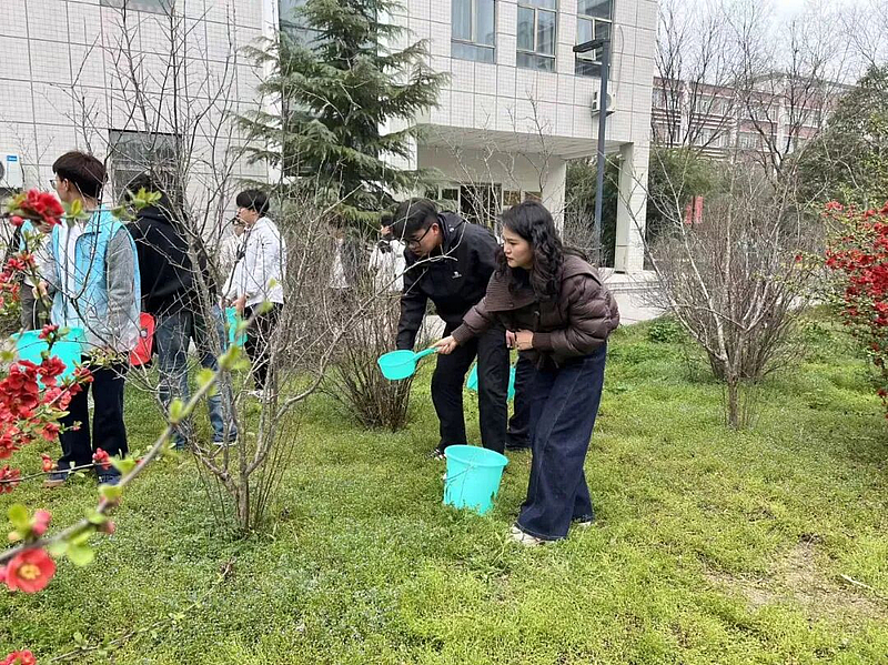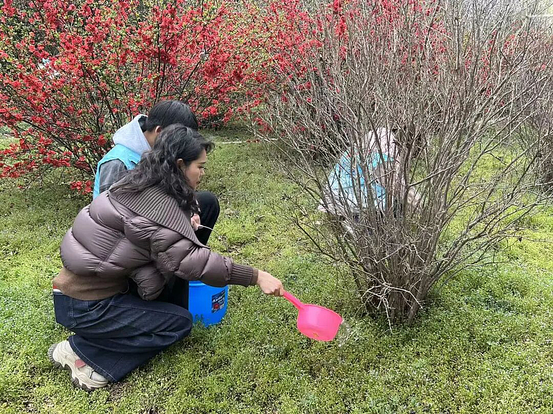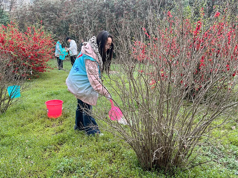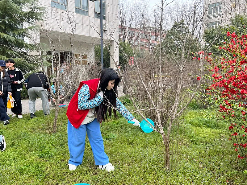 在石榴园养护区域,浇灌组志愿者提桶接水、往返奔波,将清水精准浇灌至树木根部,用心为绿植“解渴增养”。劳动过程中,同学们相互配合、协同发力,在欢声笑语中完成各项任务,既美化了校园环境,也在实践中掌握了基础养护知识,进一步增强了生态环保意识与责任担当。