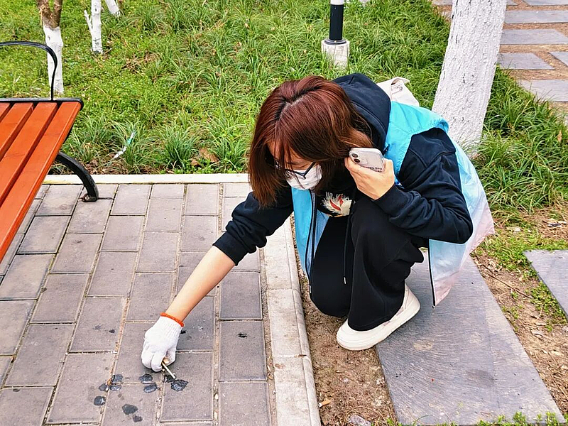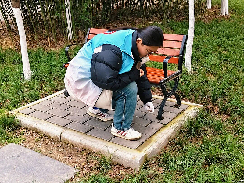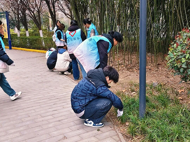 在南苑餐厅小路周边绿化区域,清理组志愿者化身“校园环境卫士”,俯身细致清理草丛、石缝等卫生死角,认真捡拾纸屑、塑料瓶、枯枝落叶等杂物,做到分类整理、集中清运,以双手还原绿化区域洁净面貌。