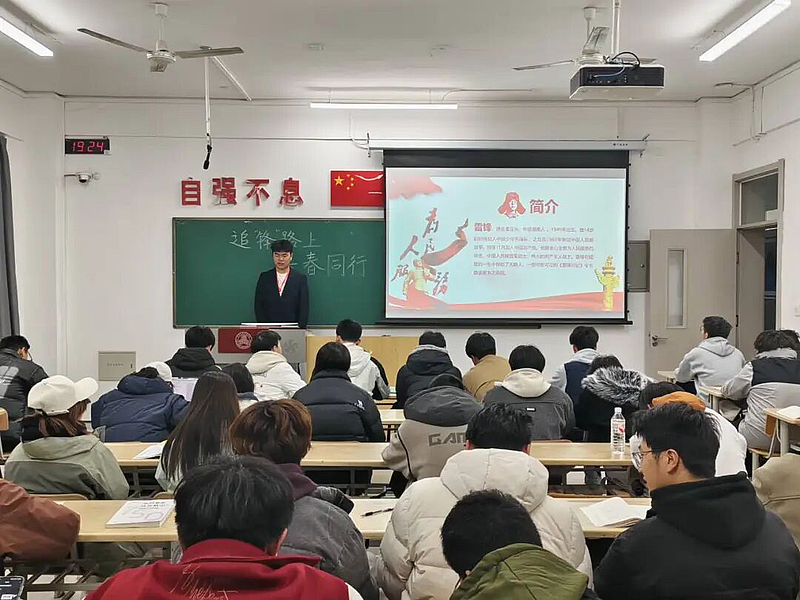 团课伊始,姚舜泽同学从雷锋精神的核心内涵与时代价值切入,系统阐释了雷锋精神中热爱祖国、服务人民、爱岗敬业、艰苦奋斗的崇高品格,点明其并非抽象符号,而是融入日常的善意与担当,是当代青年实现人生价值、投身家国建设的重要精神指引。随后,主持人结合当代青年与雷锋精神的内在共鸣,通过志愿服务、岗位坚守等鲜活案例,展现雷锋精神在新时代的生动传承,让同学们直观感受到雷锋精神从未远去,始终与青年成长同频共振。