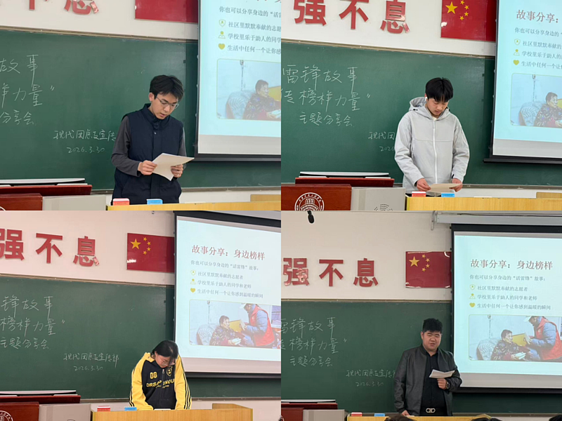 故事分享环节,同学们依次登台,深情讲述雷锋冒雨护送老人、坚守岗位、热心助人等经典事迹,同时结合身边“活雷锋”的真实故事,用朴实真挚的语言、鲜活生动的细节,展现了雷锋精神跨越时代的永恒价值。一段段感人故事、一句句真情流露,赢得现场阵阵掌声,让榜样力量直抵人心。