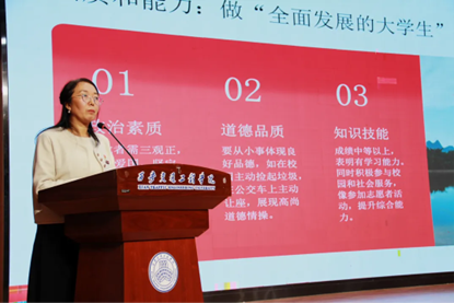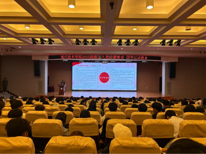 团总支书记黄晶作题为《砥砺奋进 挺膺担当 做新时代好青年》的专题讲解,从基础团务知识、学生干部培养、第二课堂活动、社会实践与志愿服务四个维度,全面介绍了学院团学工作的育人理念与实践成效。她不仅讲解了智慧团建系统、“三会两制一课”等基础团务内容,还通过学院辩论赛夺冠、获评“志愿服务先进集体”等实例,生动展现了团学活动作为“实践课堂”的育人价值——既是提升综合素质、锤炼意志品质的平台,也是连接校园与社会的桥梁。她鼓励新生主动融入团学组织,在文体活动中提升人文素养,在志愿服务中培养奉献精神,在实践锻炼中增强综合能力。她指出,个人成长与集体发展息息相关,希望新生以团学工作为起点,将青春活力转化为推动学院发展的正能量,以“挺膺担当”的奋斗姿态迎接成长挑战,在服务集体、奉献社会的过程中实现自我价值,努力践行“有理想、敢担当、能吃苦、肯奋斗”的新时代青年精神。