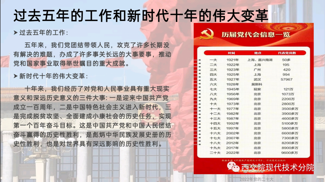 此次党课由王莉同志主讲,先是带领大家回顾了过去五年的工作和新时代十年我国的伟大变革。向大家展示了历届党代会的信息,在从1921年党的一大到2022年党的二十大,党员人数越来越多,彰显党的活力,表明人民群众都对共产党有着非常高的认可度。并通过一问一答的方式带领同学们学习了党的二十大报告关键内容和报告中的新表述、新概括,使同学们对党的二十大精神有了更加全面深刻的了解领悟。