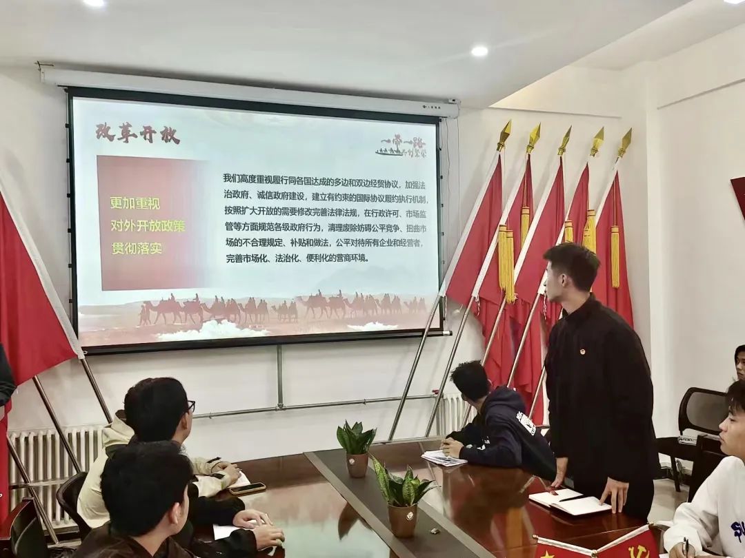 党课伊始,阿维鑫同学先对“一带一路”理念做了简要介绍,并就共建原则、国际意义、战略实施的内容为大家进行了部分解读。他分享道,共建一带一路”的途径是以目标协调、政策沟通为主,不刻意追求一致性,可高度灵活,富有弹性,是多元开放的合作进程。在会上,赖麒同学认为为推进“一带一路”建设,作为大学生必须脚踏实地,立足国情,修身养性,树立服务社会的良好意识,一步一个脚印,扎扎实实做事。其次可以根据自身的专业实际,去参加此类社会实践活动,是大学生走向社会,接触社会,了解社会,投身社会的良好形式。