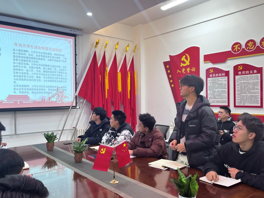 本次党课使同学们深入了解“四下基层”战略的相关知识。大大提高了党支部成员自身的思想政治水平和能力,并使同学们真切意识到要坚持党的领导,坚持爱国主义,坚定理想信念,勇于担当使命,不负时代的要求、人民的期待。