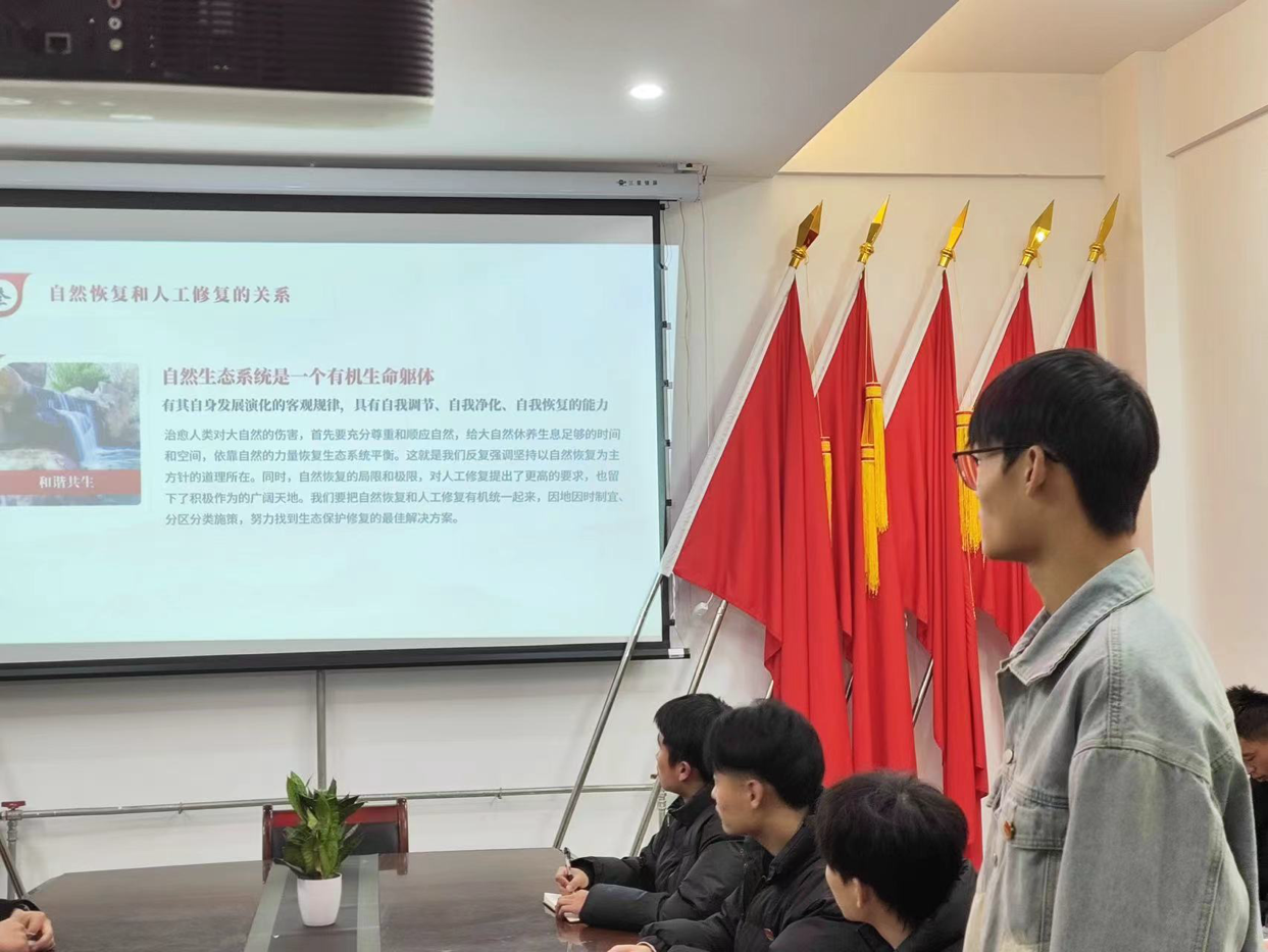 会议伊始,积极分子王广谊同学围绕习近平生态文明思想的形成及生动实践、科学内涵和践行等方面进行了讲解。通过对习近平生态文明思想的全方位解读,让大家在学习中深刻领会到践行习近平生态文明思想的重要性,是建设美好校园环境、幸福生活的理论支撑,把思想建设转化为全员的自觉行动,每个人都成为生态环境的保护者、建设者和治理者。