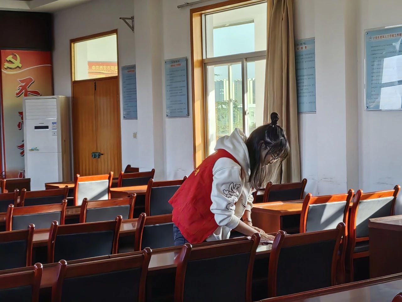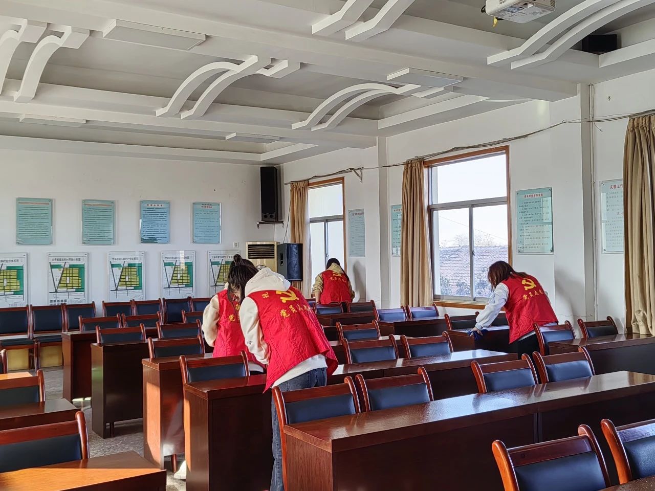 在参观完村落后,志愿者们自发开始打扫会议室卫生,志愿者同学们有的扫地,有的整理并规范物品的摆放,每个人都默默地贡献着自己的力量。通过相互之间的默契配合,会议室很快就被打扫得焕然一新。大家不怕脏、不怕苦、不怕累,在劳动中充分展示互助、有爱、奉献、进步的精神,用实际行动助力乡村振兴。