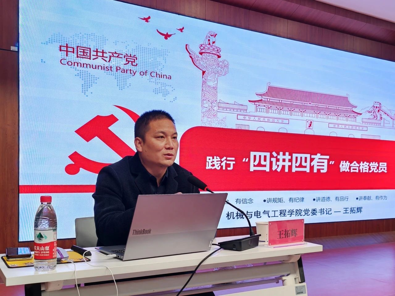 王拓辉讲述不同历史时期信仰、初心、忠诚、担当的基本概念和关系,为大家讲述在中国革命和建设的历史时期,合格共产党员的标准是什么、什么样的党员才算合格的共产党员。他表示成为一名合格党员要从四个方面做起,要有坚不可摧的信仰,中国共产党把共产主义确立为远大理想,党之所以能建立新中国是因为党有远大理想和崇高追求;要有实现伟大目标的初心,中国共产党人的初心和使命是全心全意为人民服务;要有践行信仰初心的忠诚,忠诚是检验共产党人的第一标准,是建立在理想信念基础上的信仰忠诚,要坚定理想信念、心中有党、对党忠诚;要有永恒不变的担当精神,担当是共产党人的崇高政治品格,是检验党性的一块“试金石”,要以知重负重、知难向难、干事扛事的实际行动,诠释对党的忠诚、对人民的赤诚,践行对“两个确立”“两个维护”的担当。