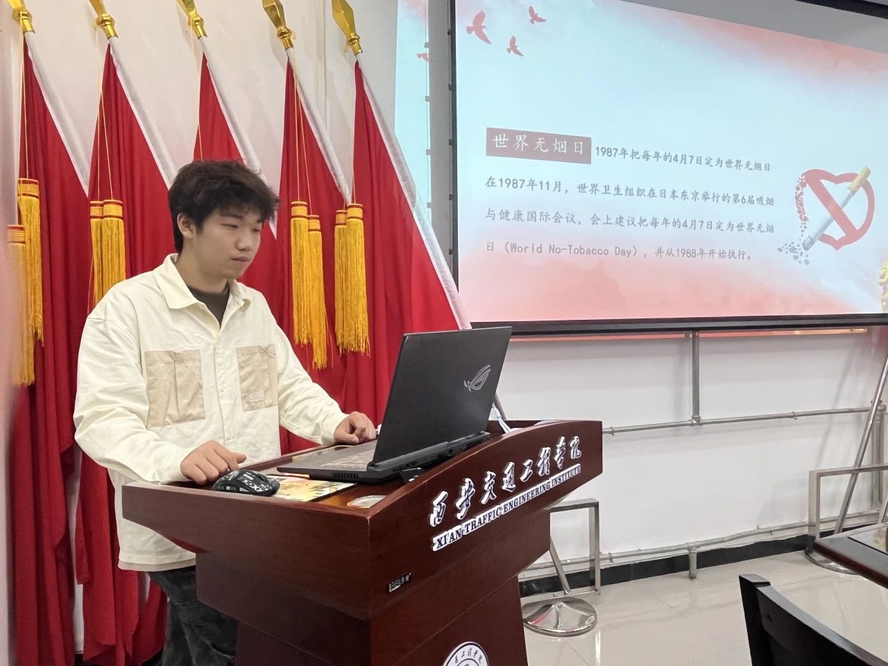 为迎接第37个世界无烟日,营造绿色、健康、文明的无烟校园环境,树立和展现伟德国际victor·1946源自学生良好的精神面貌和文明形象,提高全院学生禁烟意识,引导学生树立健康的生活方式,5月29日,伟德国际victor·1946源自学生第二党支部在6-212开展“健康校园 远离烟草”主题党日活动,活动由中共预备党员郑汉主持。