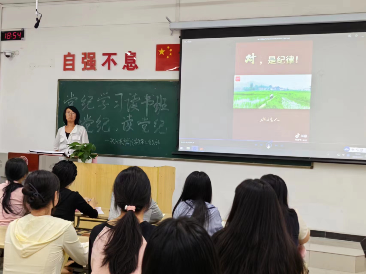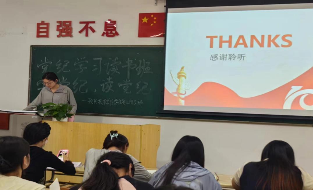 最后,田佳丽老师总结,她指出思想是行动的先导,信仰是力量的源泉。纪律是党的生命线,是全面从严治党的重要保障。要严格执行党的政治纪律和政治规矩,坚决维护党中央权威和集中统一领导。党纪学习读书班的建立是为了让积极分子要先学先谋先做,团结协作、敢于担当,要真正做到正人先正己;加强党性修养,强化自我塑造,做好带头表率。