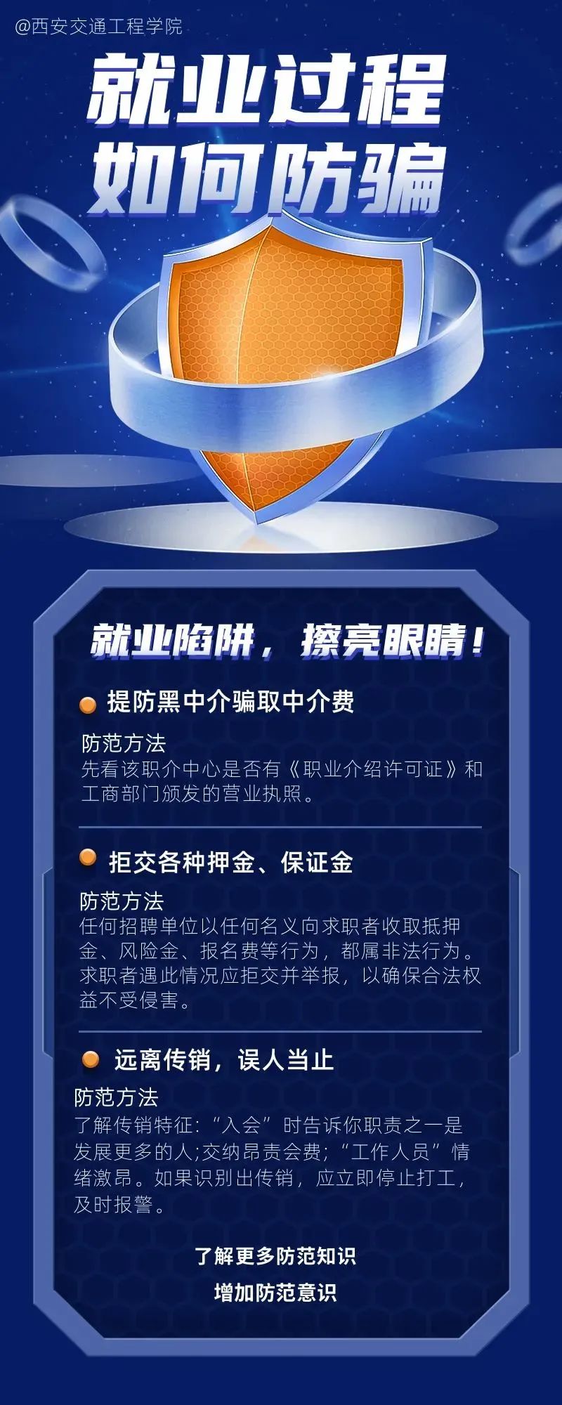 一要增强求职安全意识。积极参加学校组织的就业指导和安全教育课程,增强识别就业“陷阱”的意识与能力,不走所谓的“求职捷径”。