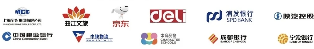中国邮政集团有限公司、中国工商银行股份有限公司、中国建设银行股份有限公司、上海浦东发展银行股份有限公司、中国农业银行股份有限公司、成都银行股份有限公司、宁波银行股份有限公司、杭州银行股份有限公司、长安银行股份有限公司、浙江泰隆商业银行、京东物流、中银金融商务有限公司、西安希格玛会计事务所、和田教育局、中育品格教育集团、吉的堡教育集团、西安市曲江第二幼儿园、西安市曲江第五幼儿园、西安市曲江第六幼儿园、西安市曲江第七幼儿园、陕西师范大学锦园幼儿园、航天幼儿园、西安曲江文化旅游集团等。