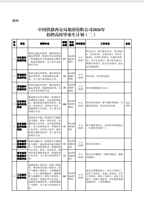 中国铁路西安局集团有限公司根据企业发展需求, 拟采取校园招聘方式招聘全日制普通高校专科(高职)毕业生,现将有关事项公告如下: