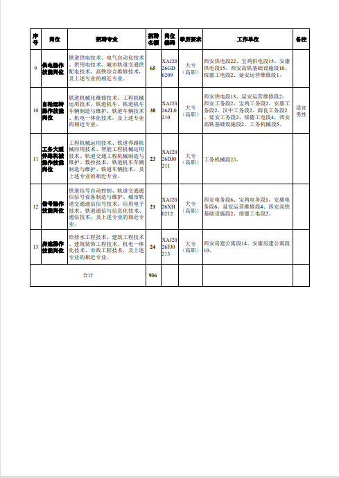 本次计划招聘936人,招聘岗位均为铁路运输生产一线操作技能岗位。招聘岗位、专业、工作地点及人数等内容详见附件。