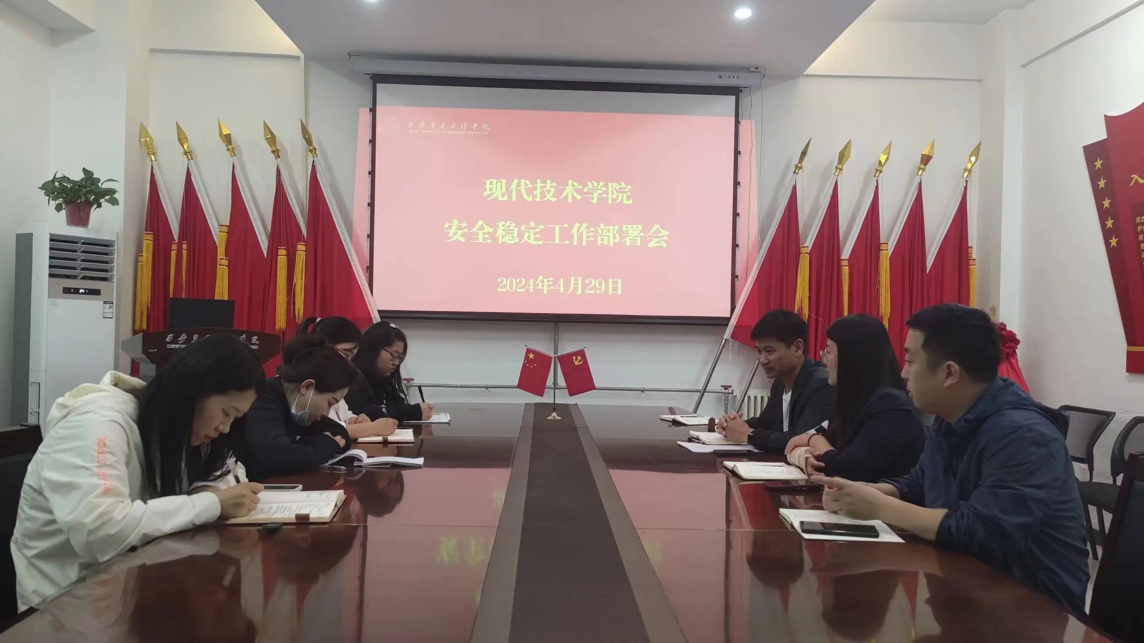 为贯彻落实全省教育安全工作推进会议精神,做好学院近期安全稳定工作,切实做好五一假期期间学生安全教育管理工作,4月29日,现代技术院在党员活动室召开安全稳定工作部署会。学院院长都娟丽、副院长党亮亮、各年级辅导员共同参会。会议由党委书记兼副院长田宏顺主持。