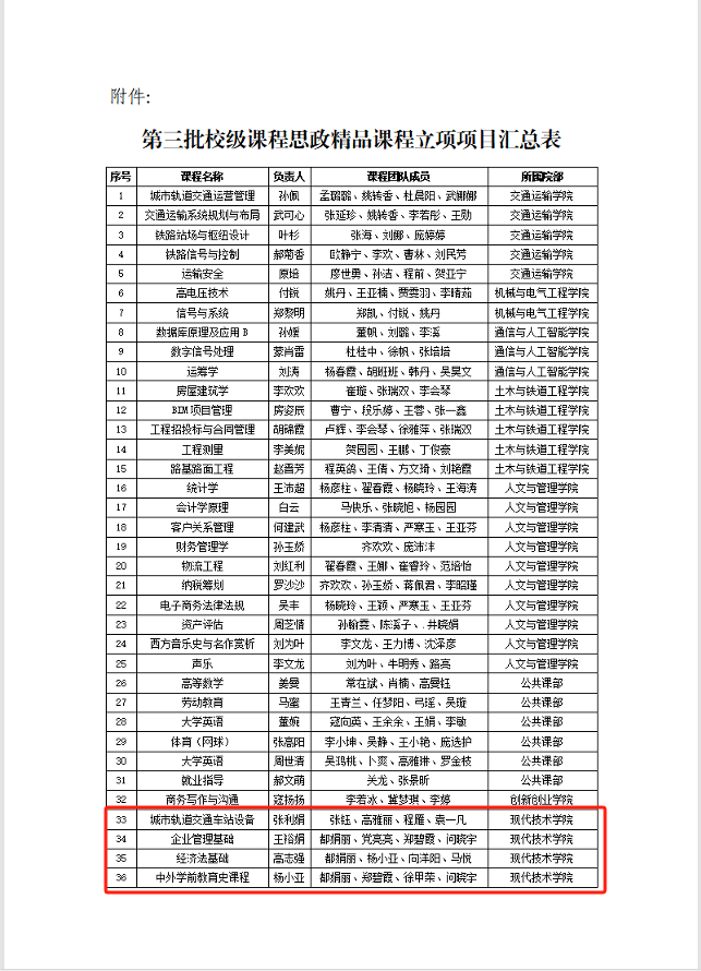2025年10月28日,2025年度课程思政精品课立项结果正式揭晓,我院《城市轨道交通车站设备》《企业管理基础》《经济法基础》《中外学前教育史》4门课程成功获批。自办学以来,学院始终坚守“立德树人”根本任务,以“课程载道、思政铸魂”为核心导向,将课程思政建设作为深化教育教学改革、提升人才培养质量的战略支点。