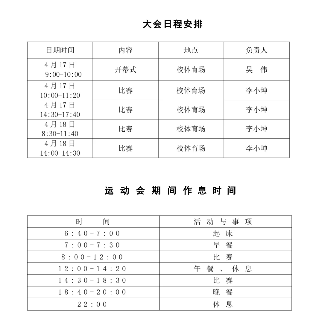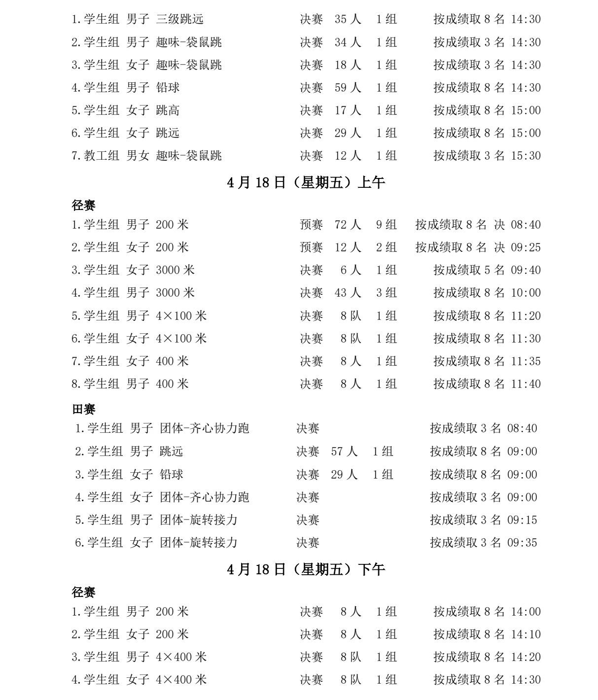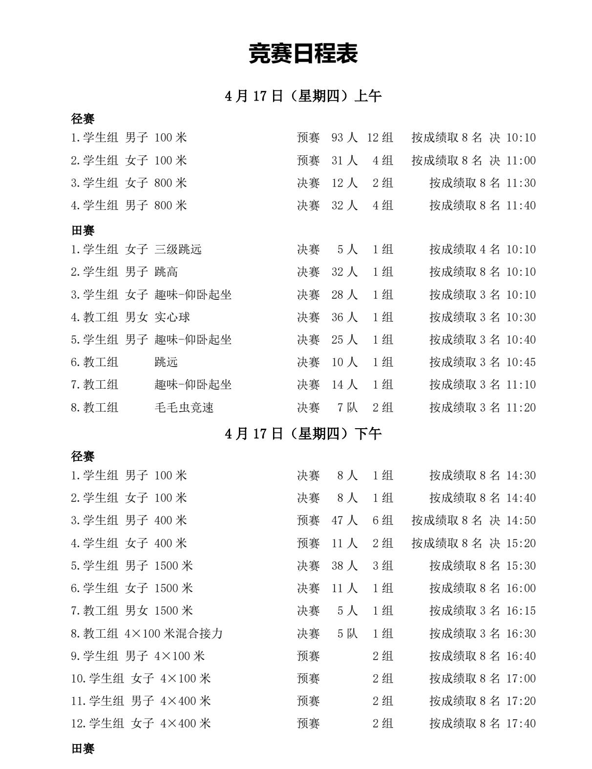 2. 教工组(9项):4×100 米混合接力、1500 米、跳远、实心球、100 米旋转接力、趣味仰卧起坐、齐心协力跑、袋鼠跳、毛毛虫竞速。 以下是此次运动会的赛程安排让我们一睹为快吧!