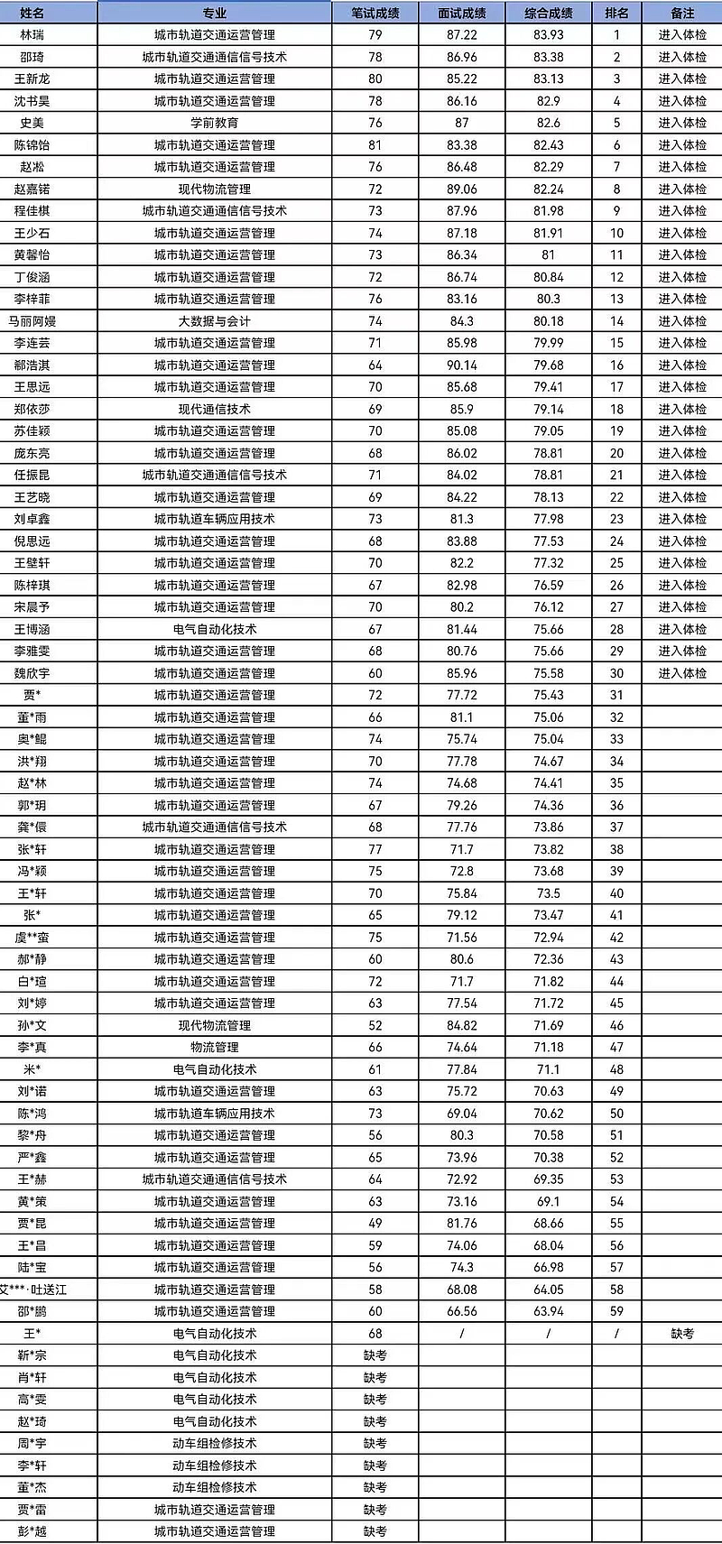 嘉兴市市域铁路运营管理有限公司组建定向班(订单班)笔试、面试工作已全部结束,现将笔面试、综合成绩及入围体检人员名单予以公示,公示时间自2025年10月27日至10月31日。