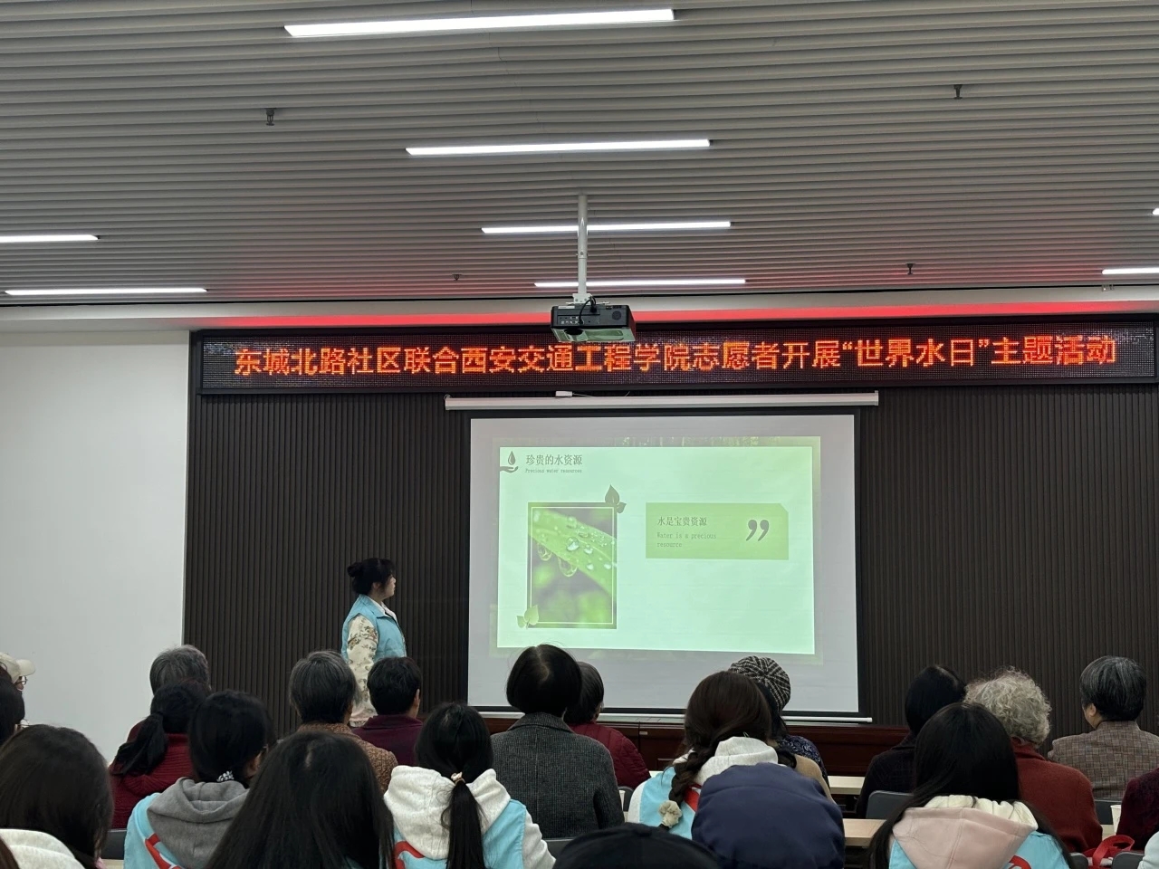 活动伊始,由志愿者代表陈先超同学进行关于水资源保护的宣讲。她向居民和同学们详细讲解了水资源的有限性、全球水危机现状以及日常生活中节约用水的重要性,通过生动的案例和数据,呼吁大家从点滴做起,珍惜每一滴水,保护我们共同的水资源。